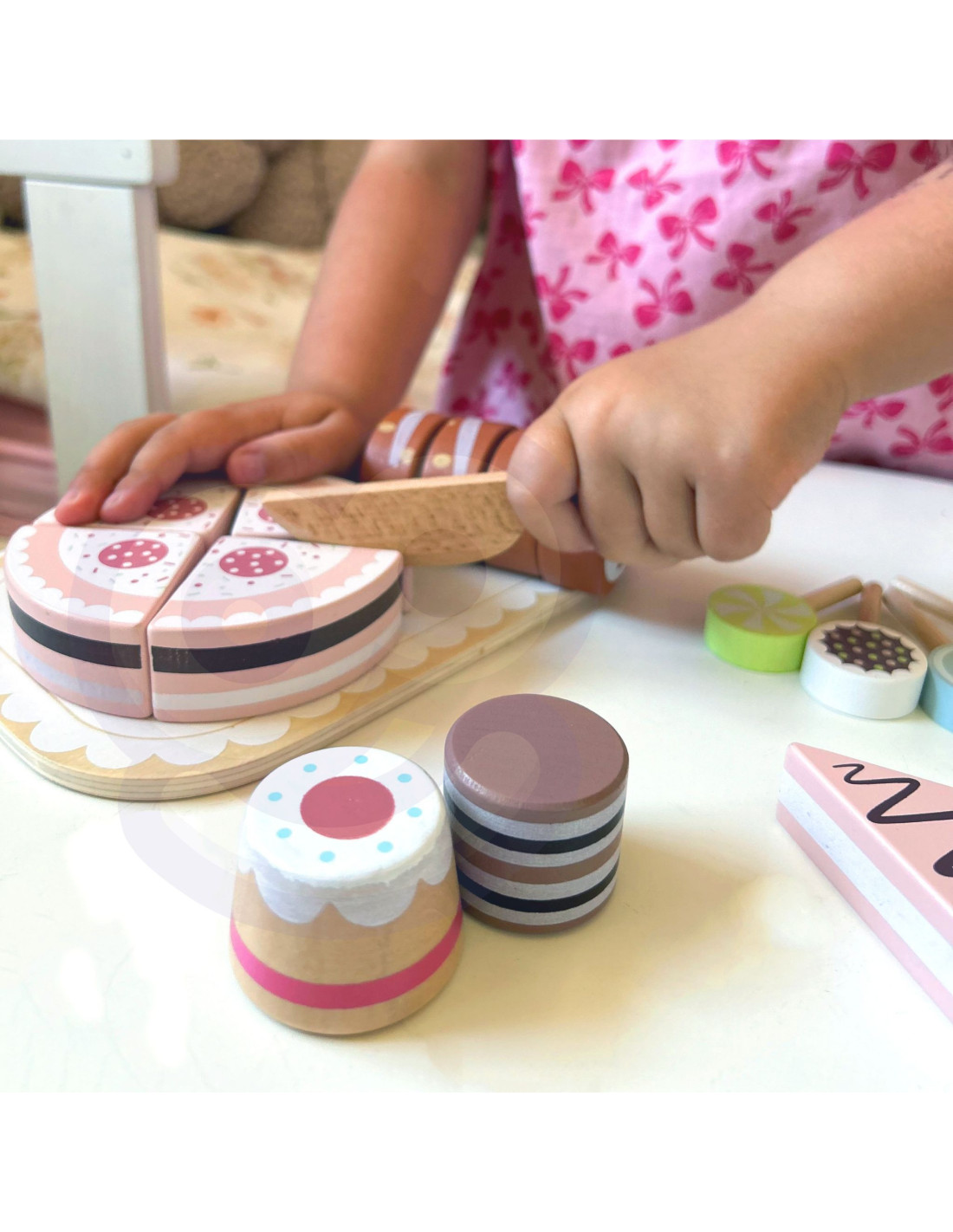 - - Zestaw zawiera: Pudełko, tort, roladę, babeczkę, muffinkę, ciastko, pączka, kawałek ciasta, 4 lizaki, 2 lody w wafelku, 2 filiżanki, 2 łyżeczki, 2 widelce, nożyk