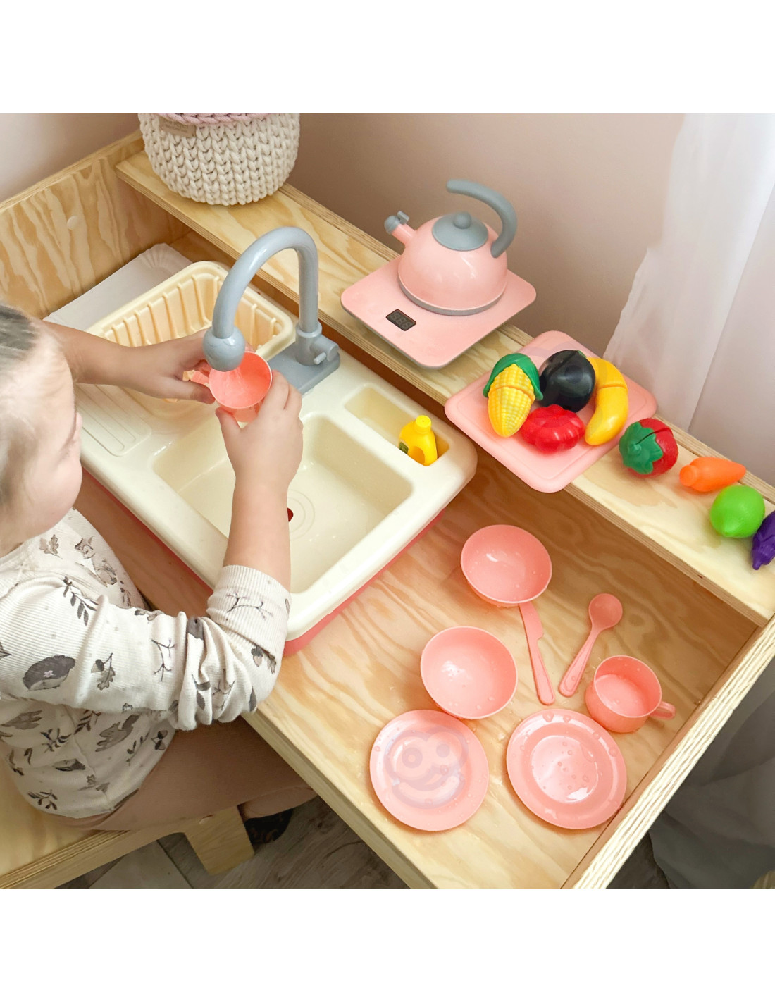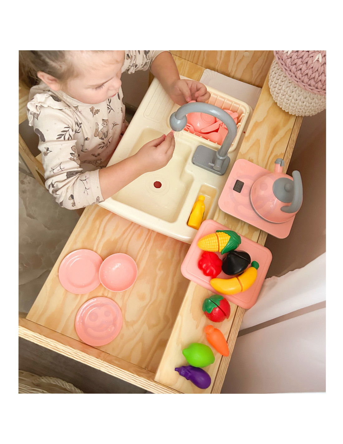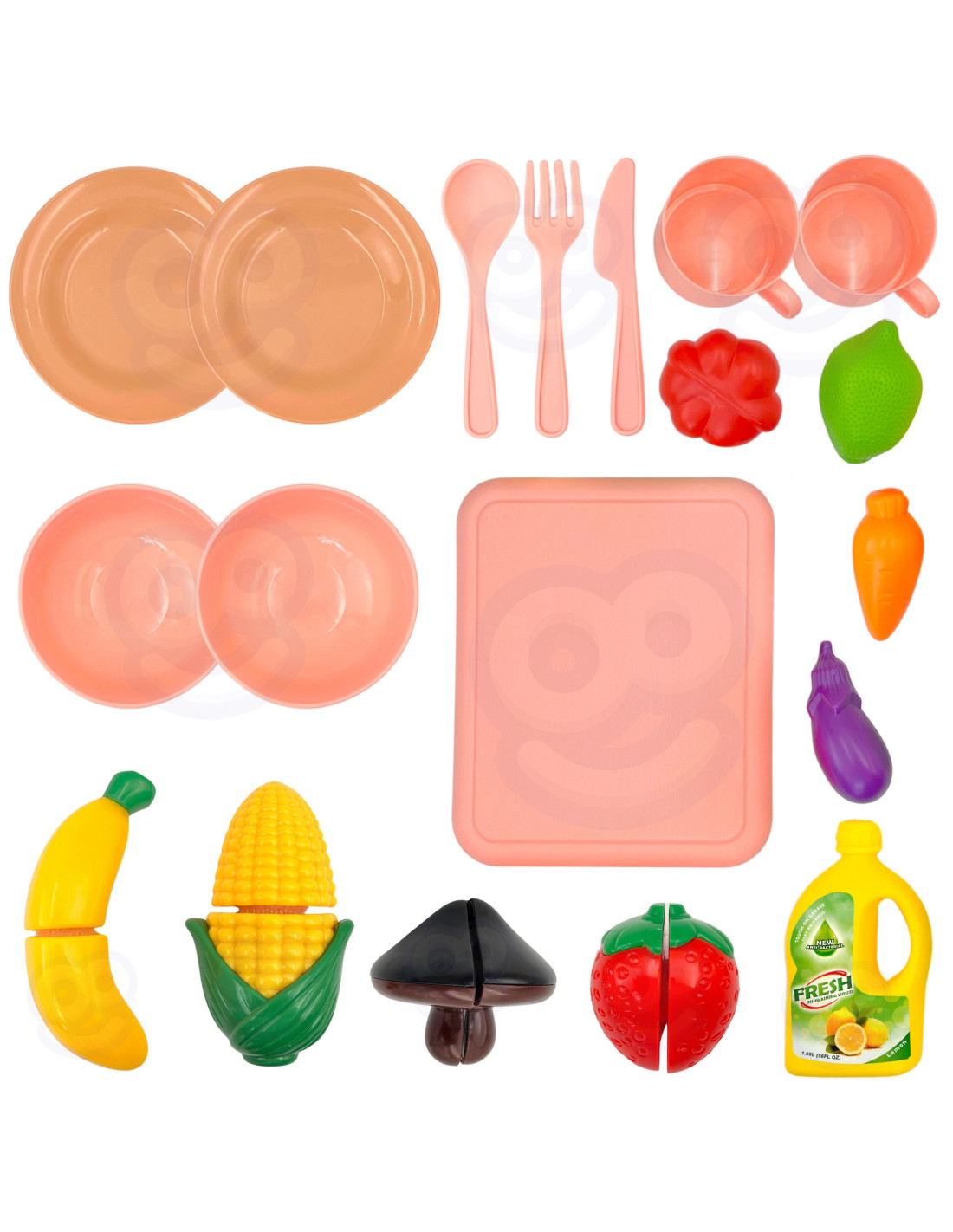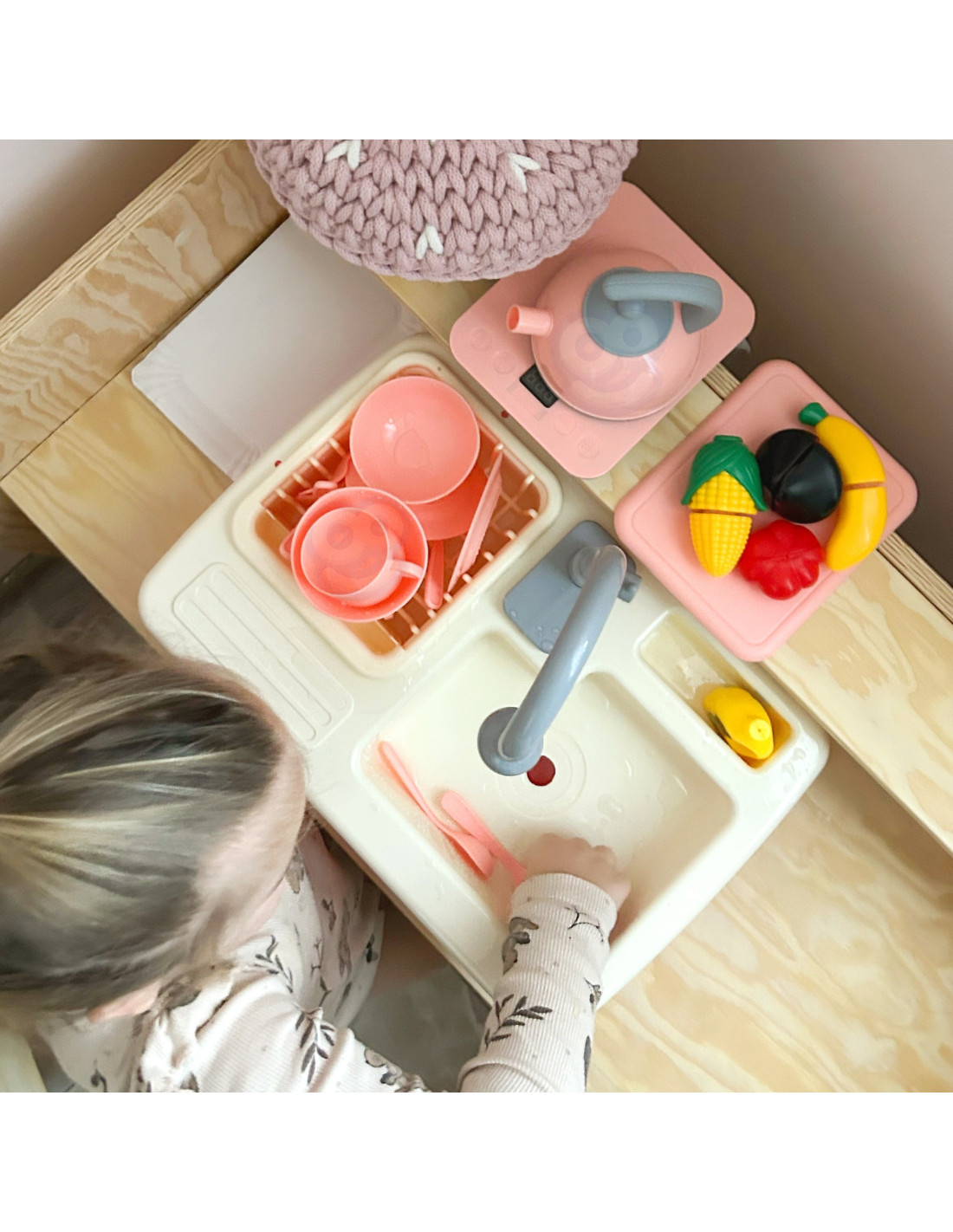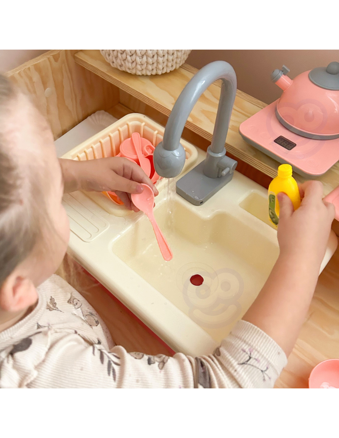 Zlewozmywak Kuchenka 2w1 od marki WOOPIE pozwoli dzieciom gotować i zmywać tak jak ich rodzice - naśladować od najmłodszych lat! Zabawka jest doskonale odwzorowana, dzięki czemu dziecko ma wrażenie, że wykonuje prawdziwe czynności kuchenne.Posiada ruchome elementy jak kurek od kranu, z którego leci prawdziwa woda. Wystarczy wlać do misy modę i zobaczyć jak dziecko się bawi, a po wszystkim wystarczy opróżnić dolną misę. Dodatkowo owoce i warzywa są połączone rzepem, dzięki czemu twoje dziecko może przekroić je na pół, jak prawdziwe produkty! Zabawa w gotowanie, zmywanie naczyń i wykonywanie podobnej pracy, pomaga dzieciom nabrać poczucia odpowiedzialności i samodzielności, która jest ważną częścią uczenia się społeczno-emocjonalnego.