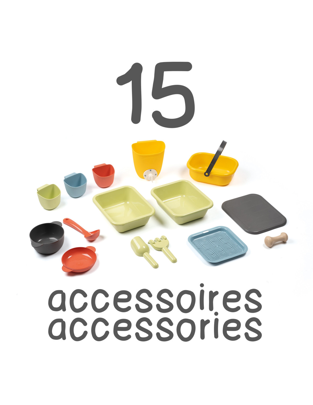 - - 15 akcesoriów w zestawie: sitko, koszyczek, chochla, grabki, łopatka.