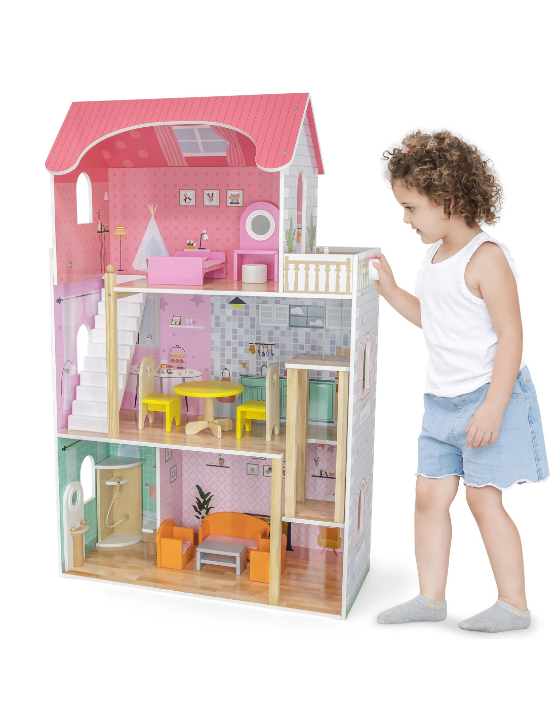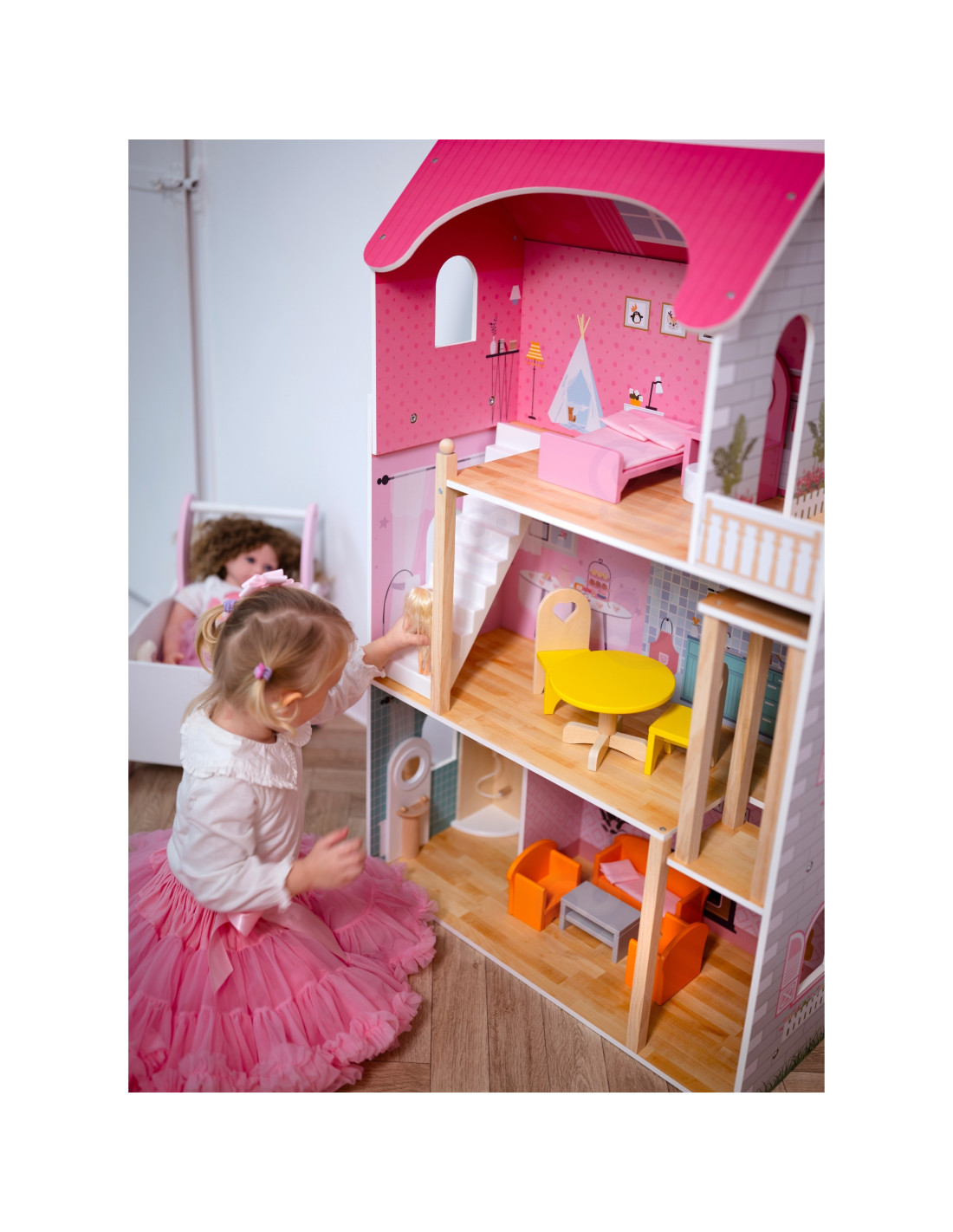Drewniany domek dla lalek to idealna zabawka dla dziewczynek. W domku znajdziemy wiele pomieszczeń, dzięki czemu każda dziewczynka może odgrywać każdą rolę swoimi małymi laleczkami, figurkami, czy misiami.