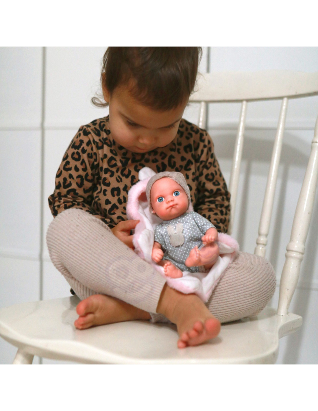 Ta urocza laleczka ma buzię, która zawsze jest gotowa na uśmiech i spojrzenie pełne ciepła. Jej realistyczne rączki, stópki i buzia i reszta ciała wykonane są z miękkiej gumy, ubrana w uroczy rampers hand made, idealna do przytulania. Bobas wyposażony jest w różowy kocyk, który zamienia się w namiot, nosidełko lub po prostu idealne okrycie na zimne dni. Dodatkowo, kocyk z uszkami sprawia, że lalka staje się jeszcze bardziej urocza i niepowtarzalna.