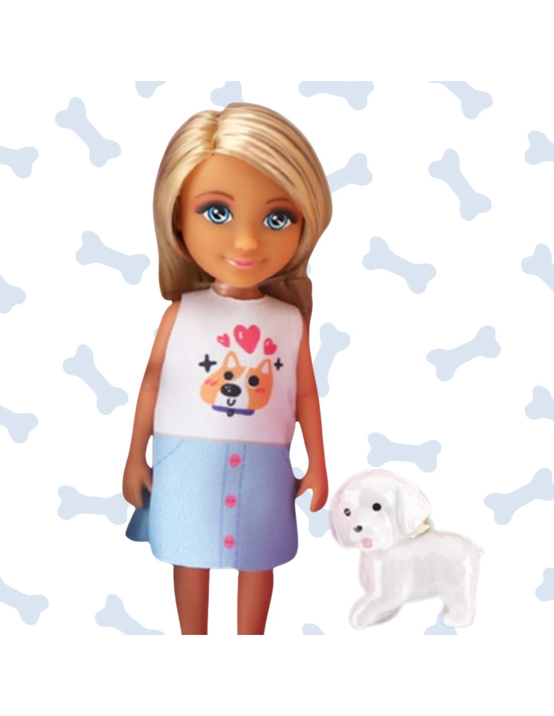 - - Śliczna laleczka z blond włosami, niebieskimi oczy, ubrana w białą bluzeczkę z uroczym nadrukiem pieska i błękitną spódniczkę.