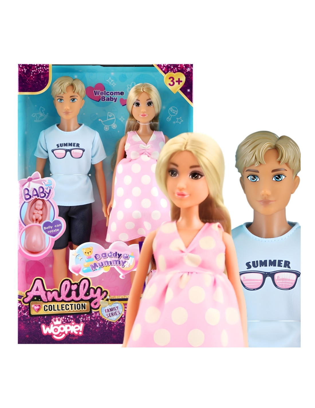 Zestaw lalek rodzinnych od marki Woopie to prawdziwa gratka dla każdego dziecka, które uwielbia odgrywać scenki z codziennego życia i tworzyć własne historie. Komplet obejmuje trzy lalki przedstawiające rodzinę: mamę w ciąży z niemowlakiem w brzuszku oraz tatę. Mama jest ubrana w różową sukienkę z białymi kropkami i białe buciki, natomiast tata w koszulkę z krótkim rękawkiem i krótki spodenki. Zestaw jest wykonany z wysokiej jakości, bezpiecznych materiałów, zestaw został zaprojektowany z myślą o najmłodszych użytkownikach. Kolorowa stylistyka, modny wygląd postaci przyciągają uwagę dzieci i zachęcają do wielogodzinnej zabawy. Zabawa tym zestawem uczy dzieci o cyklu życia, rolach rodzicielskich, wzajemnej opiece i odpowiedzialności związanej z posiadaniem dziecka. Dzieci mogą odgrywać różnorodne scenki rodzinne, tworzyć własne historie o życiu rodzinnym, co stymuluje kreatywność i rozwój emocjonalny. Całość zapakowana jest w atrakcyjne pudełko, idealnie nadające się na prezent.
