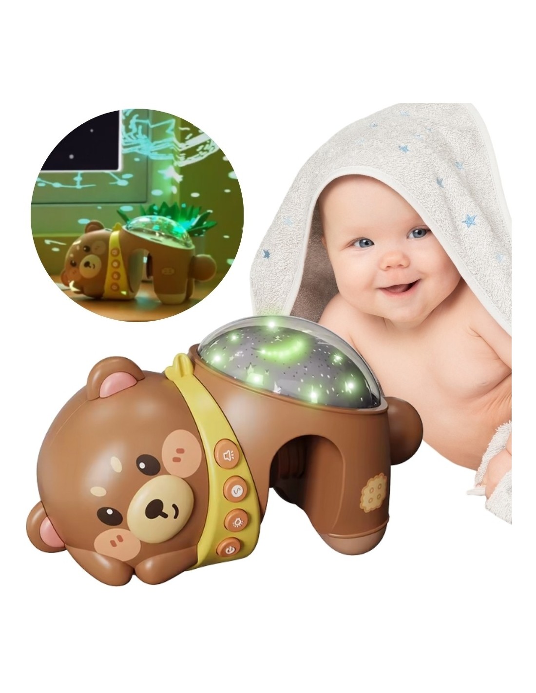 Otul swojego maluszka spokojem i magią nocnego nieba! Uroczy miś-projektor z funkcją lampki nocnej od marki Woopie to wyjątkowa pozycja stworzona z myślą o najmłodszych, które dopiero poznają świat. Dzięki rozświetlającemu się projektorowi gwiazd i wbudowanym kołysankom, ten niepozorny pluszak zamienia dziecięcy pokój w miejsce pełne harmonii i ukojenia. Miś emituje delikatne, zmieniające się światełka, które tworzą przepiękną, rozgwieżdżoną przestrzeń na suficie. Z kolei łagodne melodie i uspokajające dźwięki pomagają wprowadzić dziecko w stan relaksu i wspierają naturalny proces zasypiania. Obły kształt misia, jego przyjazny wygląd oraz bezpieczne materiały sprawiają, że jest nie tylko funkcjonalny, ale i pełen ciepła. Dzięki wklęsłej przestrzeni projektor można osadzić na barierkach łóżeczka, lub po prostu położyć go na płaskiej powierzchni. Dzięki 20 kojącym melodiom i 6 białym szumom, zabawka pozwala dopasować dźwięki do nastroju i potrzeb dziecka. Funkcja regulacji głośności umożliwia dostosowanie poziomu dźwięku do warunków w pomieszczeniu i wieku dziecka. Miś działa na 3 baterie typu AA (brak w zestawie), co zapewnia mobilność i bezpieczeństwo użytkowania – bez kabli, bez ryzyka.