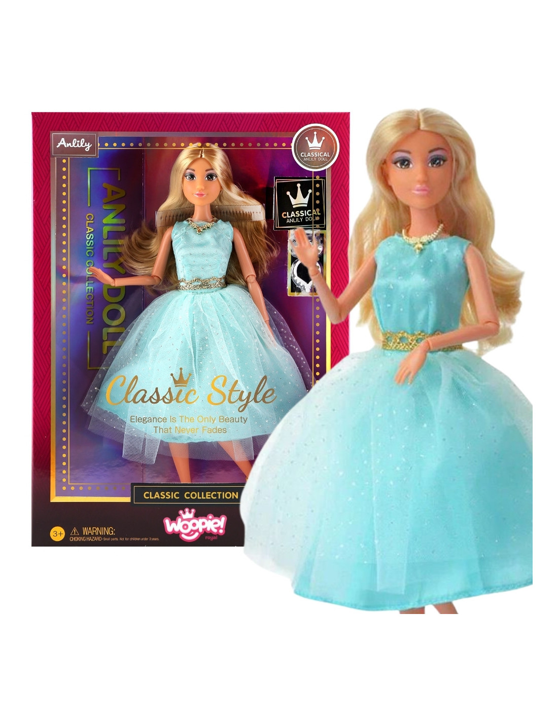 Poznaj przepiękną lalkę Lily marki Woopie Royal, która zachwyca ponadczasowym stylem i wyjątkową elegancją. Ta urocza blondynka o długich, lśniących włosach ubrana jest w bajkową sukienkę balową w odcieniu turkusu, która mieni się delikatnymi błyskami. Tiulowa spódnica nadaje kreacji lekkości i uroku, a złote dodatki – naszyjnik i pasek – podkreślają jej charakter. Dopełnieniem stylizacji są eleganckie złote szpilki, które sprawiają, że lalka wygląda jak prawdziwa gwiazda balu. To idealna towarzyszka zabawy dla każdej małej marzycielki, która uwielbia świat mody, elegancji i bajkowych