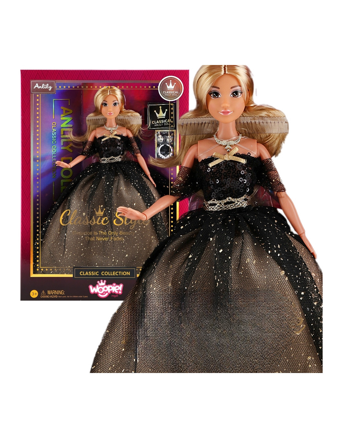 Lalka Lily marki Woopie to prawdziwa ikona stylu i elegancji! Zachwyca spektakularną wieczorową kreacją w odcieniach czerni i złota, ozdobioną tysiącami cekinów. Długie, złote włosy są idealne do tworzenia najpiękniejszych fryzur. Ta wyjątkowa lalka to inspiracja do zabawy w świat mody i eleganckich przyjęć.
