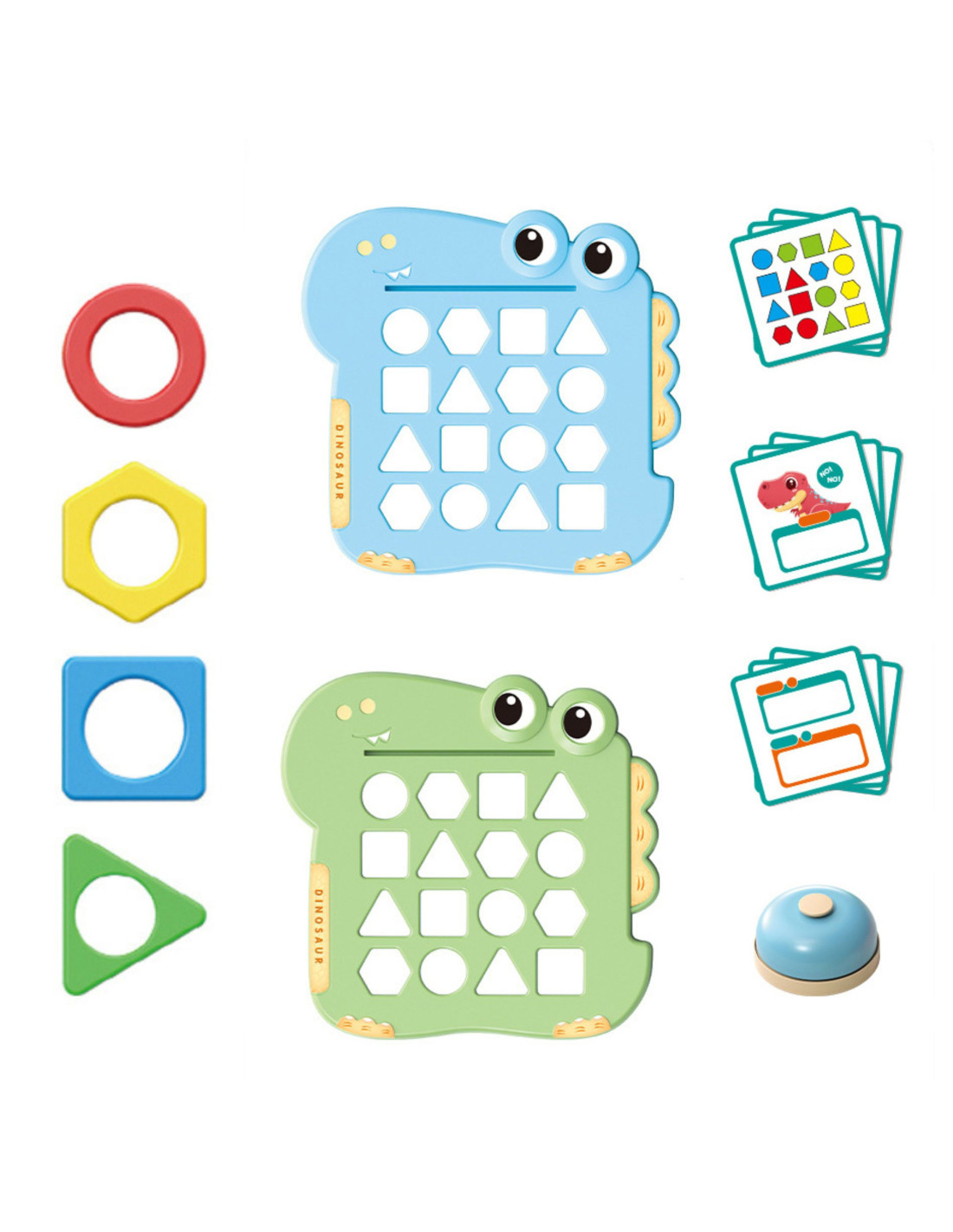- Dziecko stawia przed sobą planszę dinozaura, a obok stawia stos kart z konfiguracją ustawień kształtów