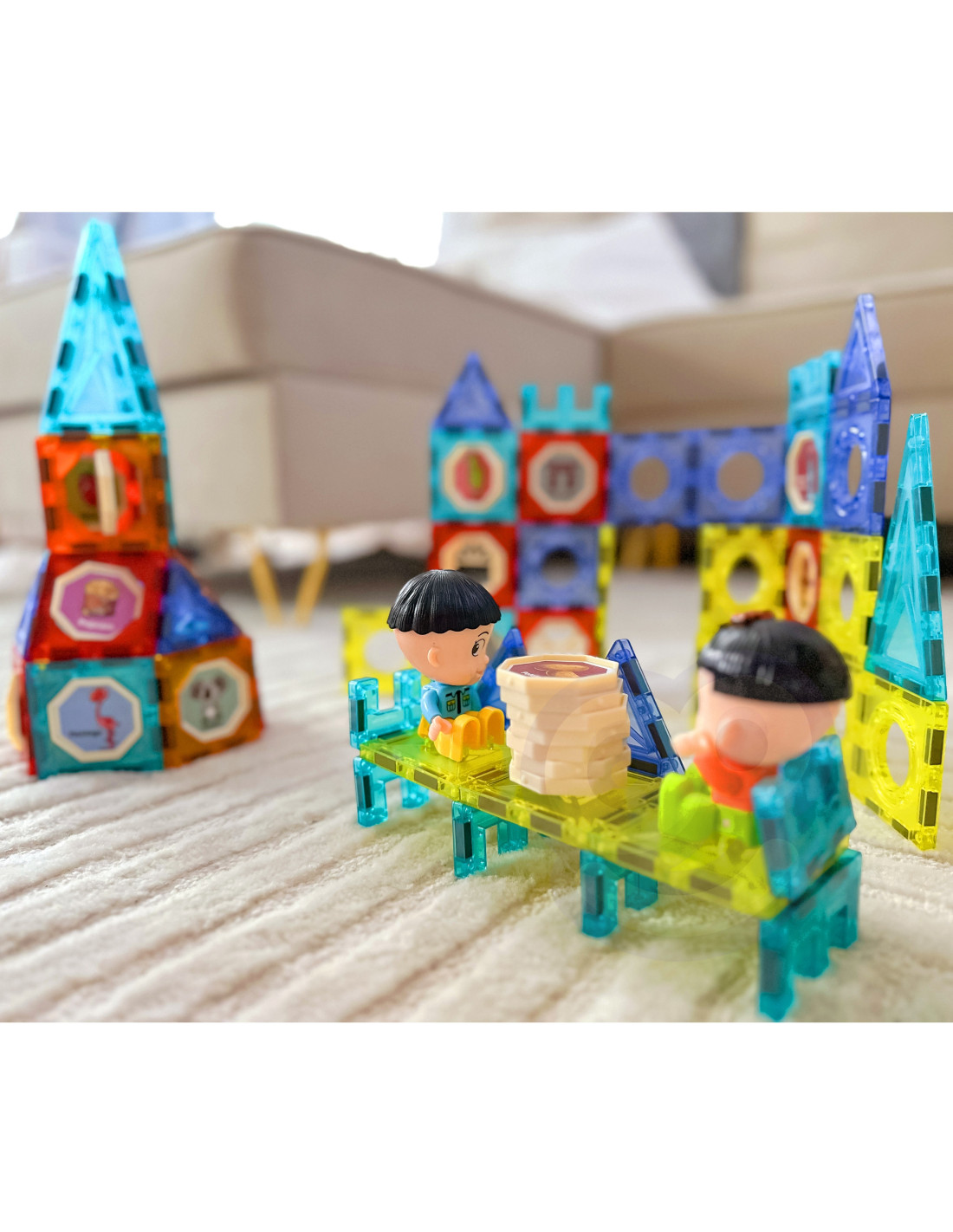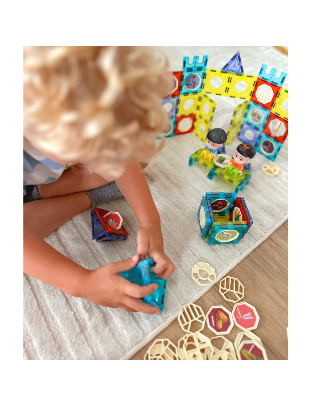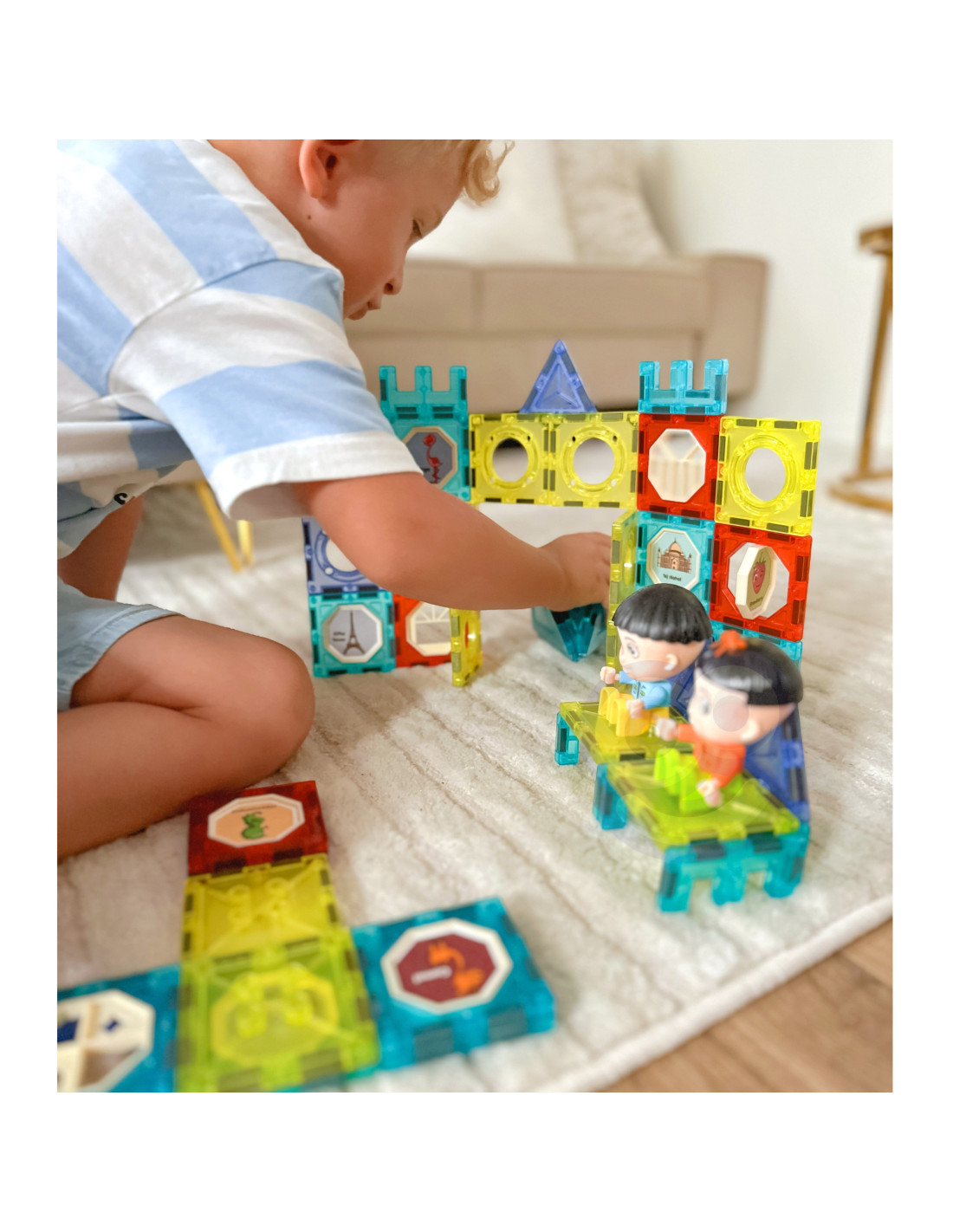 Klocki Magnetyczne od marki WOOPIE zwrócą uwagę i zafascynują Twoje dziecko. Klocki w bardzo łatwy sposób łączą się ze sobą, można z nich stworzyć wspaniałe konstrukcje np. zamek. Do zestawu oprócz klocków, naklejek i instrukcji dołączone są 2 figurki dzieci. Samo budowanie konstrukcji rozwinie u dziecka logiczne myślenie, wyobraźnie, kreatywność oraz pomoże mu skoncentrować się podczas tworzenia. Przez układanie klocków dziecko poznaje kształty i kolory oraz ćwiczy zdolności manualne tzw. motorykę małą.