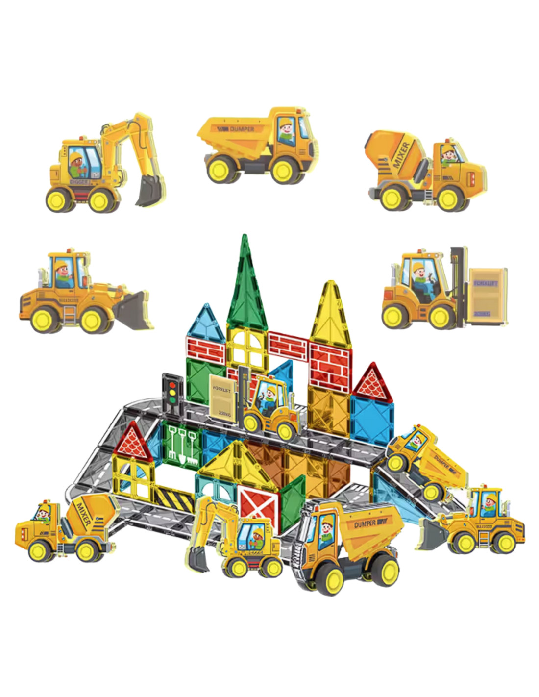 - - Zestaw konstrukcyjny z magnetycznymi klockami i pojazdami budowlanymi