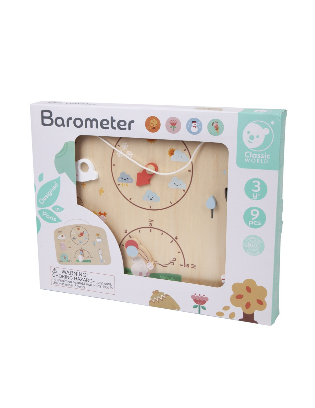 Edukacyjny Barometr od renomowanej marki Classic World to idealny produkt do nauki pogody. Edukacyjna zabawka jest wykonana z wysokiej jakości drewna, pomalowanego nietoksycznymi farbami bezpiecznymi dla dzieci. Barometr posiada zaznaczanie pogody jaką mamy obecnie, ilość opadów , siłę wiatru oraz temperaturę którą mamy na dworze. Dziecko może zabrać barometr w podróż i na bieżąco ustawiać warunki pogodowe za oknem.