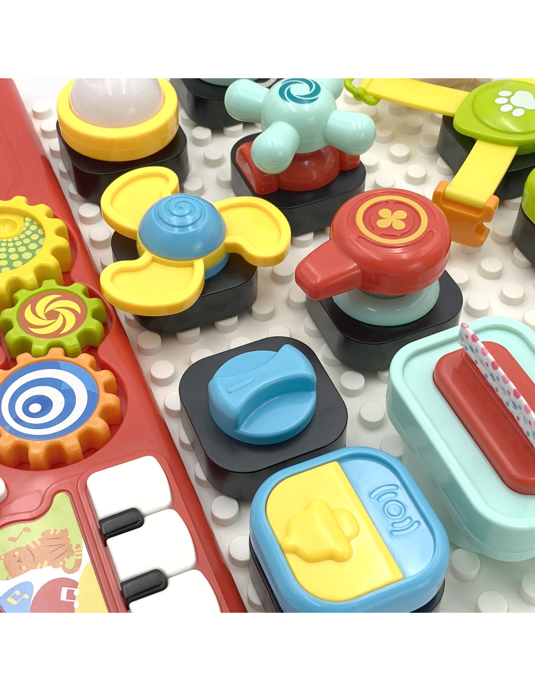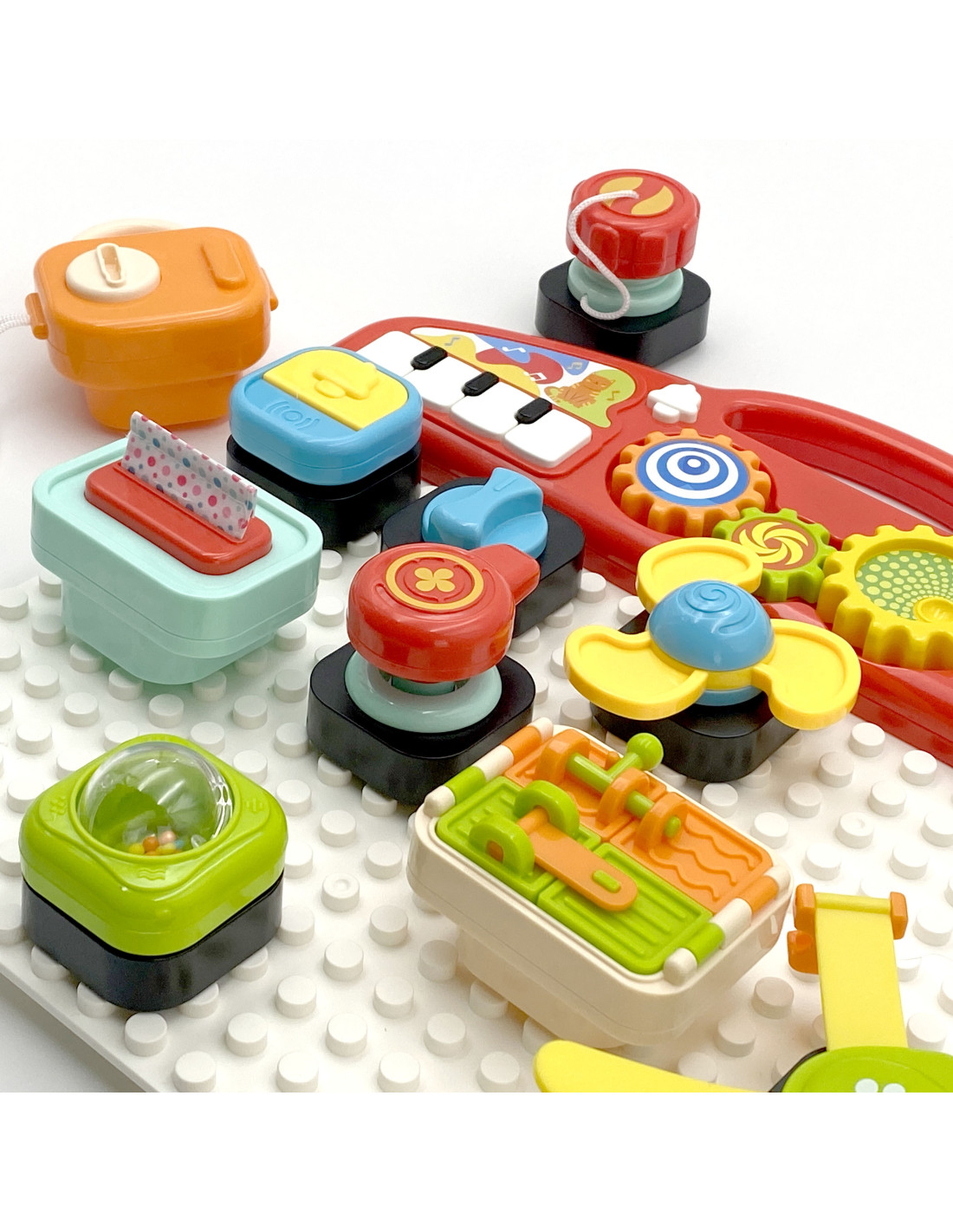 Na doczepianych klockach znajdują się różnego rodzaju przełączniki, pokrętła, przyciski, wyjmowane chusteczki, kłódka z kluczykiem, okienka otwierane na zasuwkę. Rozwijają one u dziecka umiejętności motoryczne, poznawcze i sensoryczne a także ćwiczą koordynację ręka- oko.
