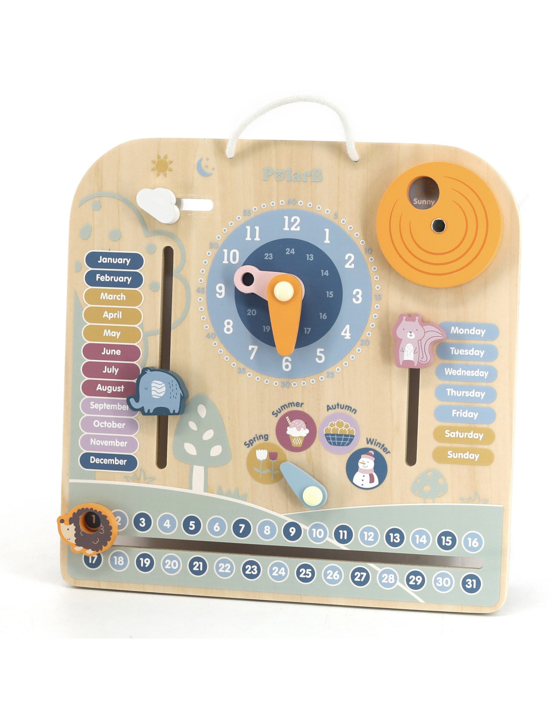 - - drewniana zabawka z zegarem i oznaczeniami: dni tygodnia, miesięcy, pór roku oraz pogody,