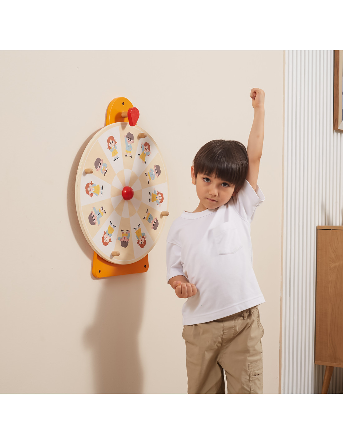 Interaktywna zabawka marki Viga wykonana z drewna. Tablica przedstawia 12 dzieci o różnych wyrazach twarzy i czynnościach. Zakręć kołem i czekaj aż się zatrzyma. Czerwona strzałka wskaże dziecko, które należy naśladować. Zabawa pomaga dzieciom odkrywać różne emocje i ruchy ciała oraz uczyć umiejętności obserwacji i szybkiego reagowania. Świetne do zajęć w szkołach i innych placówkach.