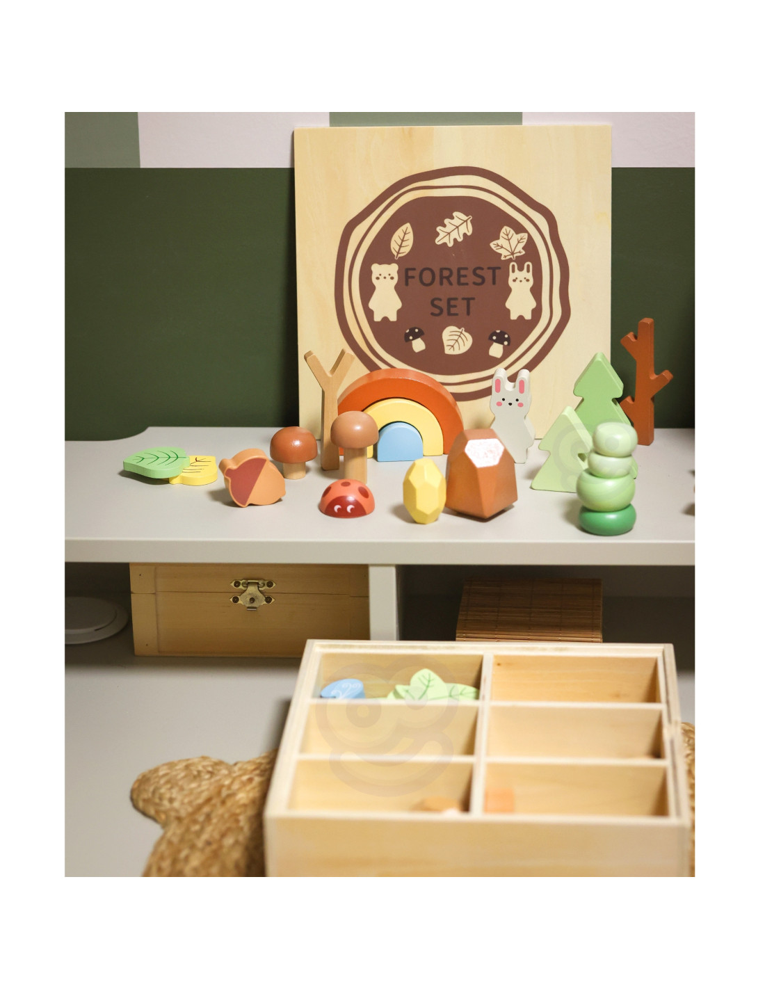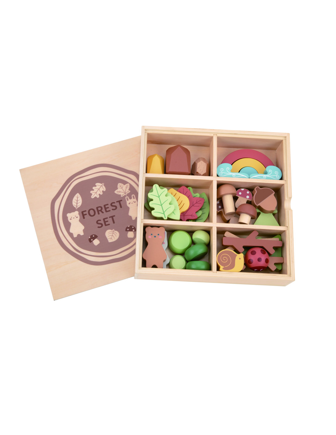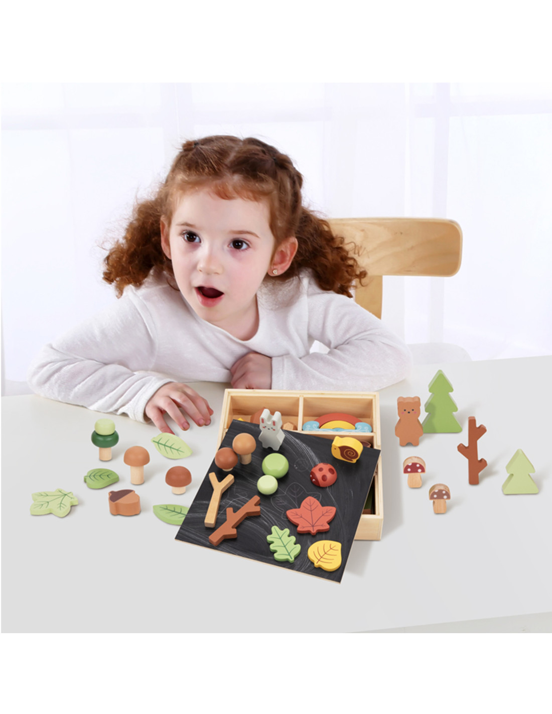 Drewniany Zestaw Leśny od Tooky Toy stworzony z myślą o zapewnieniu dzieciom niezapomnianych chwil pełnych kreatywnej zabawy. W pudełku znajdują się różnorodne elementy lasu, które umożliwiają sortowanie, układanie w stosy oraz budowanie, pozwalając na kreowanie niepowtarzalnego środowiska leśnego.