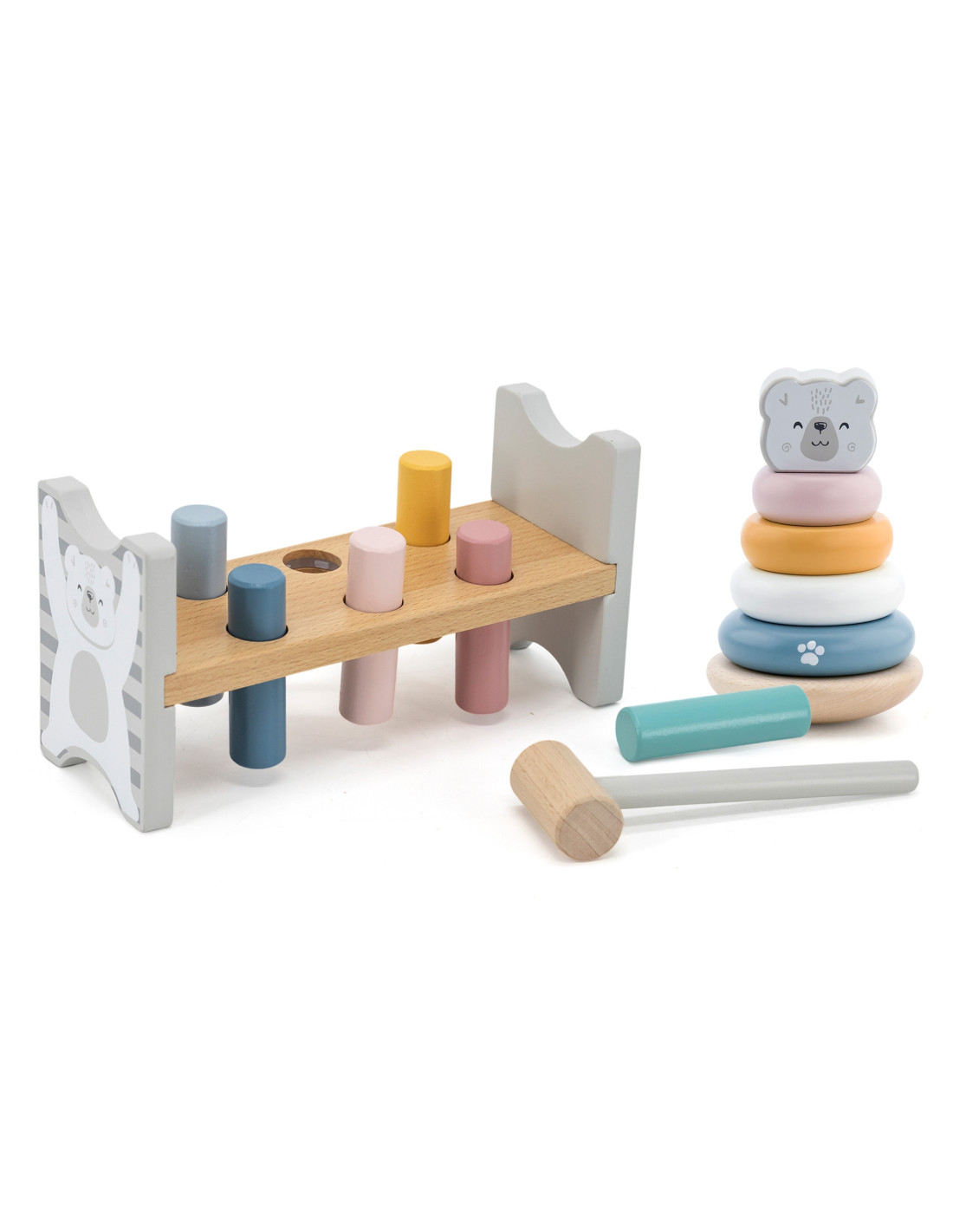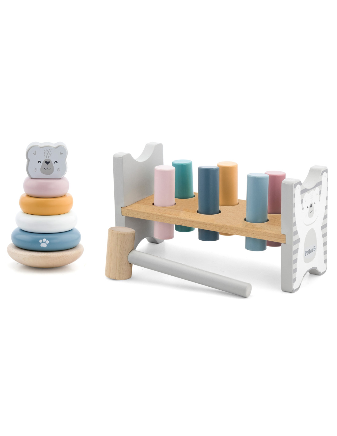 W tym zestawie z serii PolarB od marki Viga znajdziemy dwie pastelowe, drewniane zabawki: piramidkę edukacyjną oraz przebijak z młoteczkiem. Obie zabawki nie tylko wypełnią czas dziecka świetną zabawą, ale przyczynią się do rozwoju zdolności motorycznych, logicznego myślenia oraz nauki kolorów. Dzięki spędzaniu czasu z tymi zabawkami dziecko nabędzie precyzję ruchów rączek, która w przyszłości ułatwi naukę pisania.