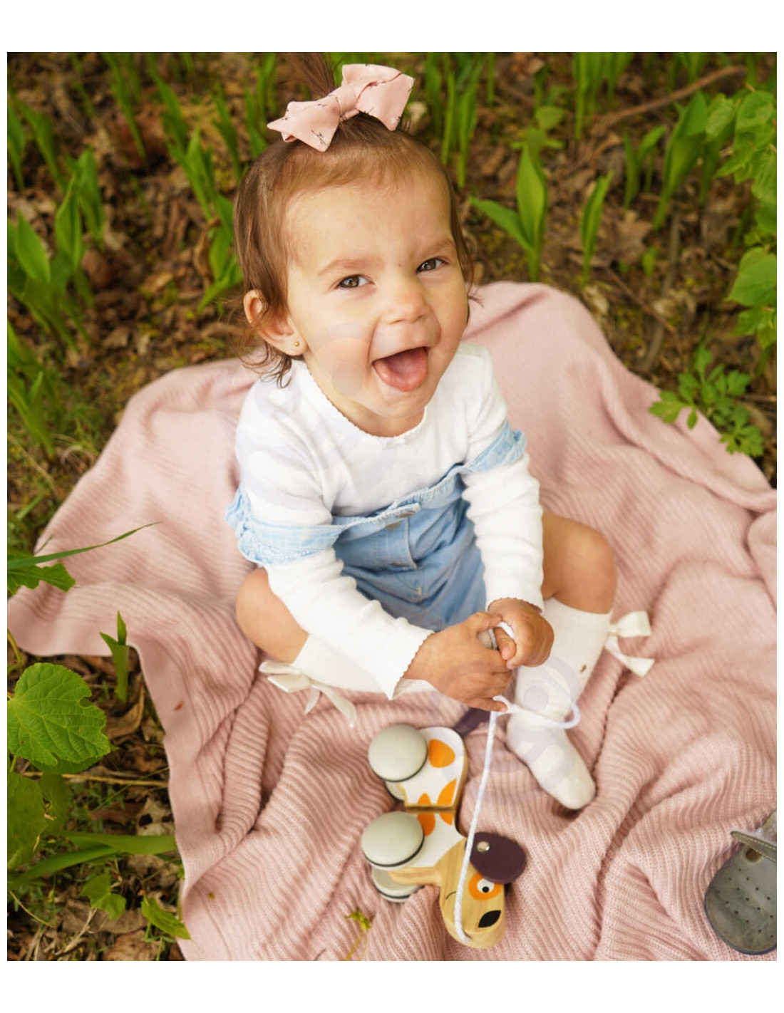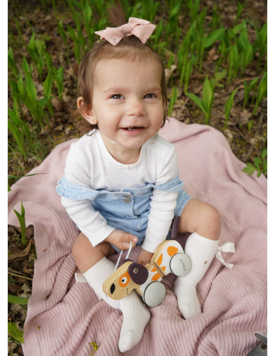 Mały szczeniaczek posiada smycz, która pozwoli wyprowadzać go na spacer po dywanie i nie tylko. Piesek podczas spacerów będzie bardzo grzeczny, a przede wszystkim będzie bardzo cichutko – na kółeczkach znajdują się gumowe nakładki. Nakładki wyciszą ewentualne stukanie. Kiedy mały smyk pociągnie za sznureczek, piesek zacznie się poruszać i wesoło merdać ogonkiem.