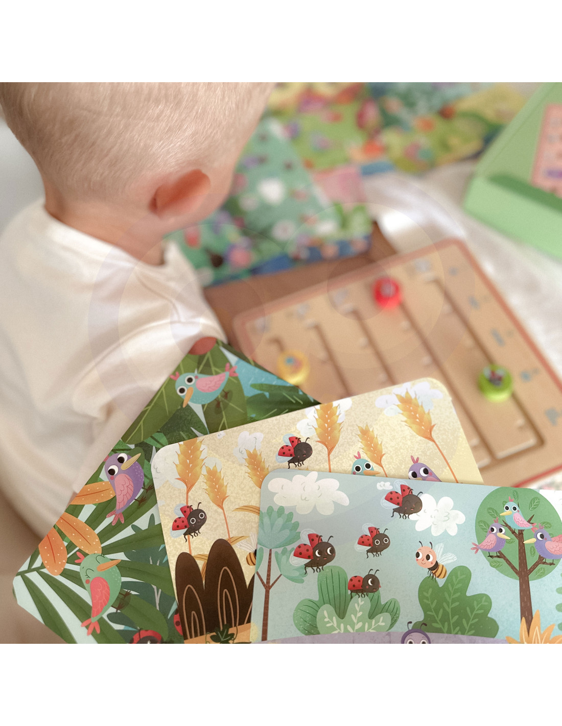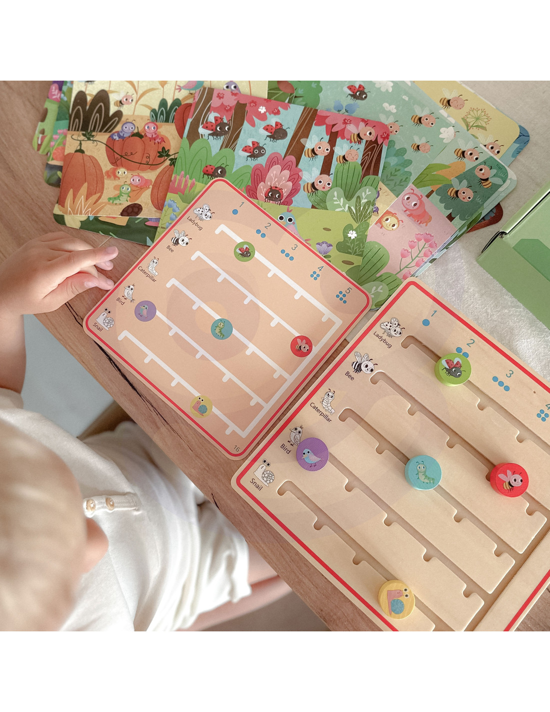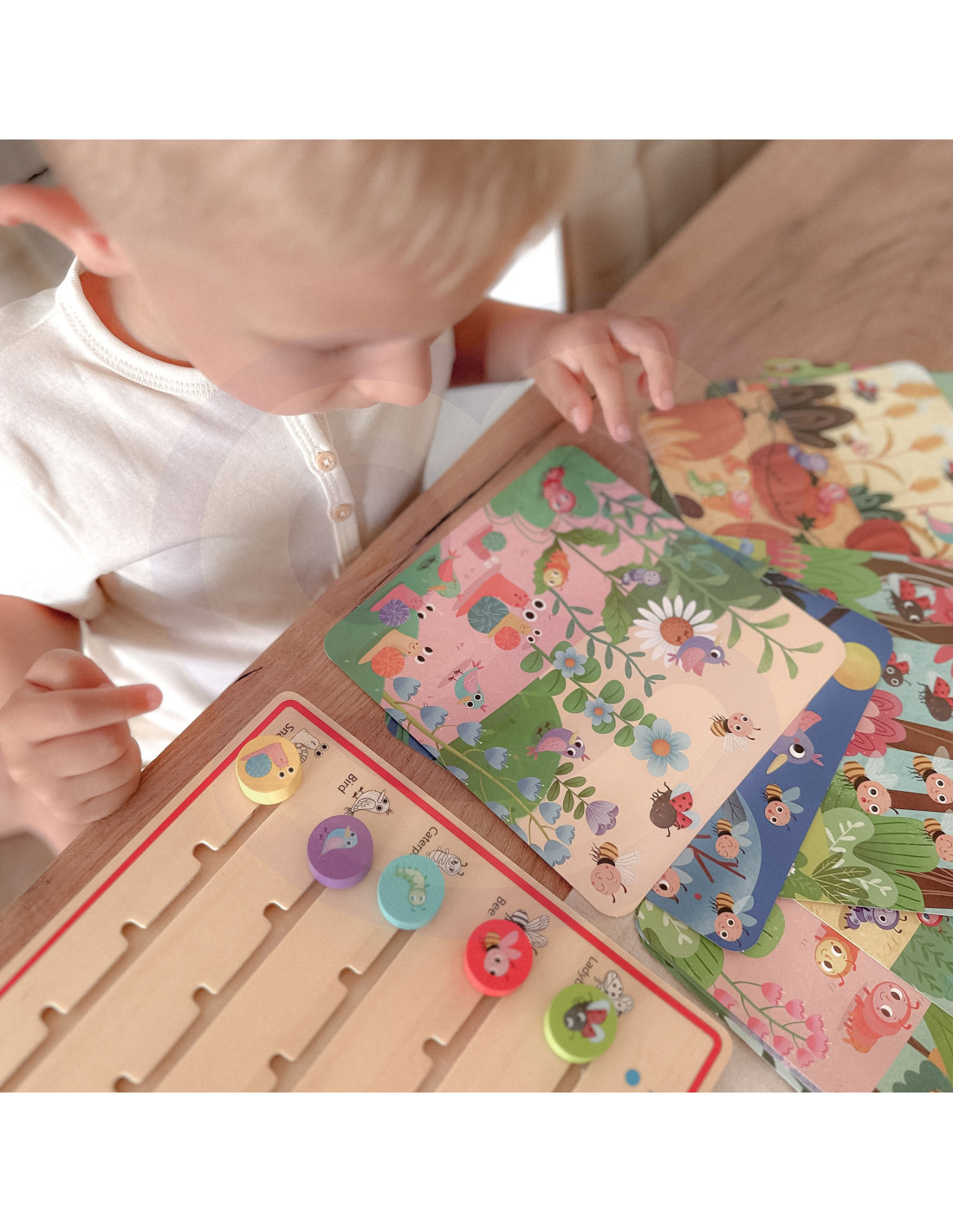 Wylosuj lub wybierz dowolną kartę i policzcie ile jest zwierzątek. Na odwrocie kart znajdziecie odpowiedzi do zadania, dzięki temu dziecko może grać także samodzielnie. Na drewnianej tabliczce znajdziecie pinezkę z biedronką, pszczółką, ślimakiem, ptaszkiem lub gąsienicą i zaznaczcie ile jest ich na obrazku. Poćwiczcie przy tym polskie i angielskie nazwy zwierzątek.