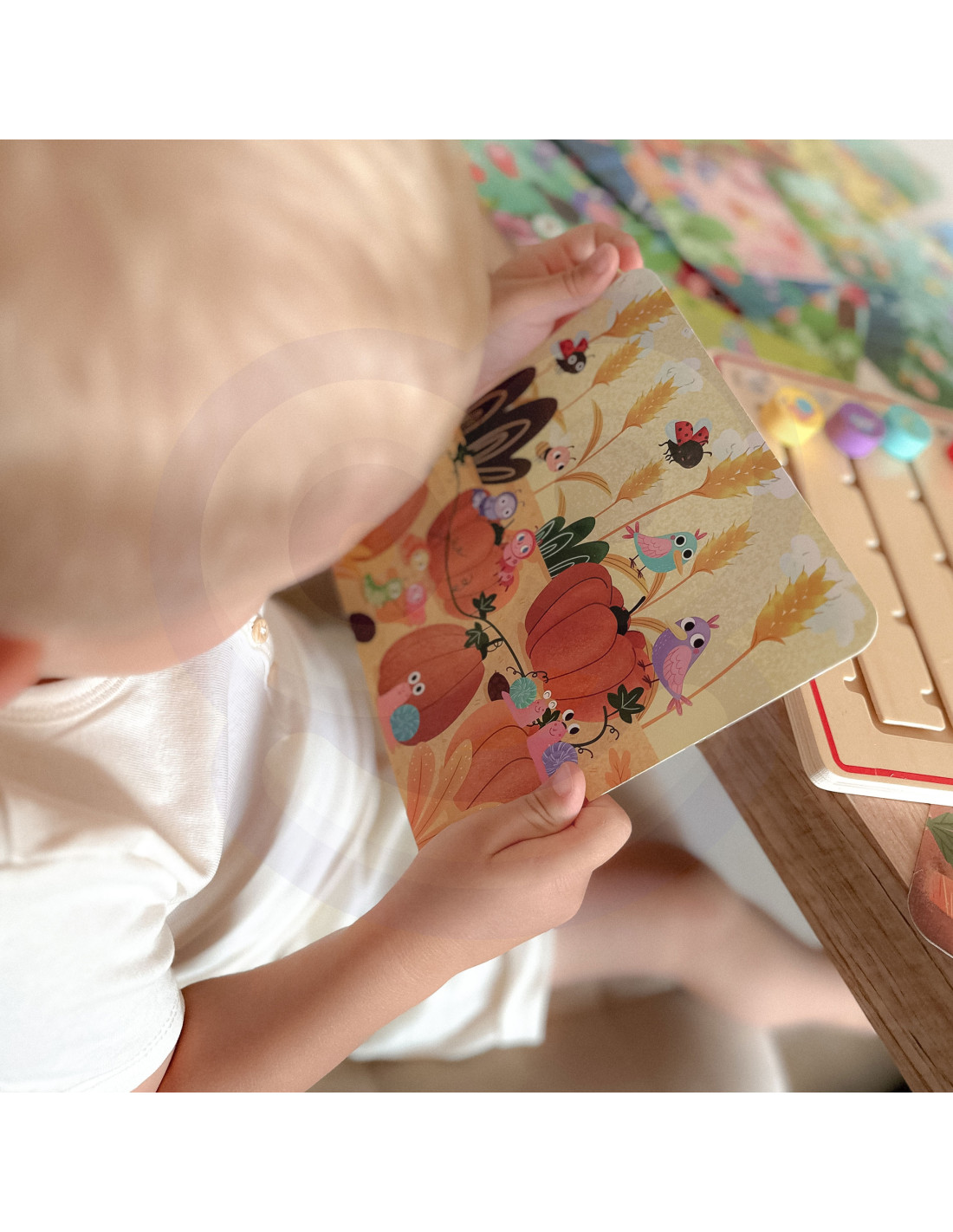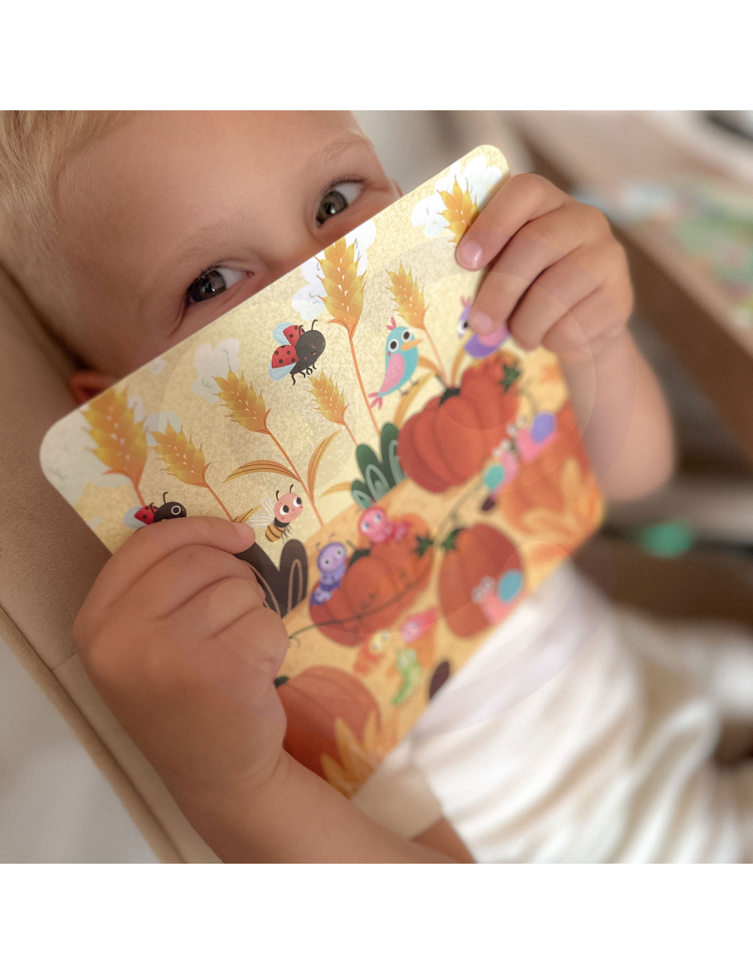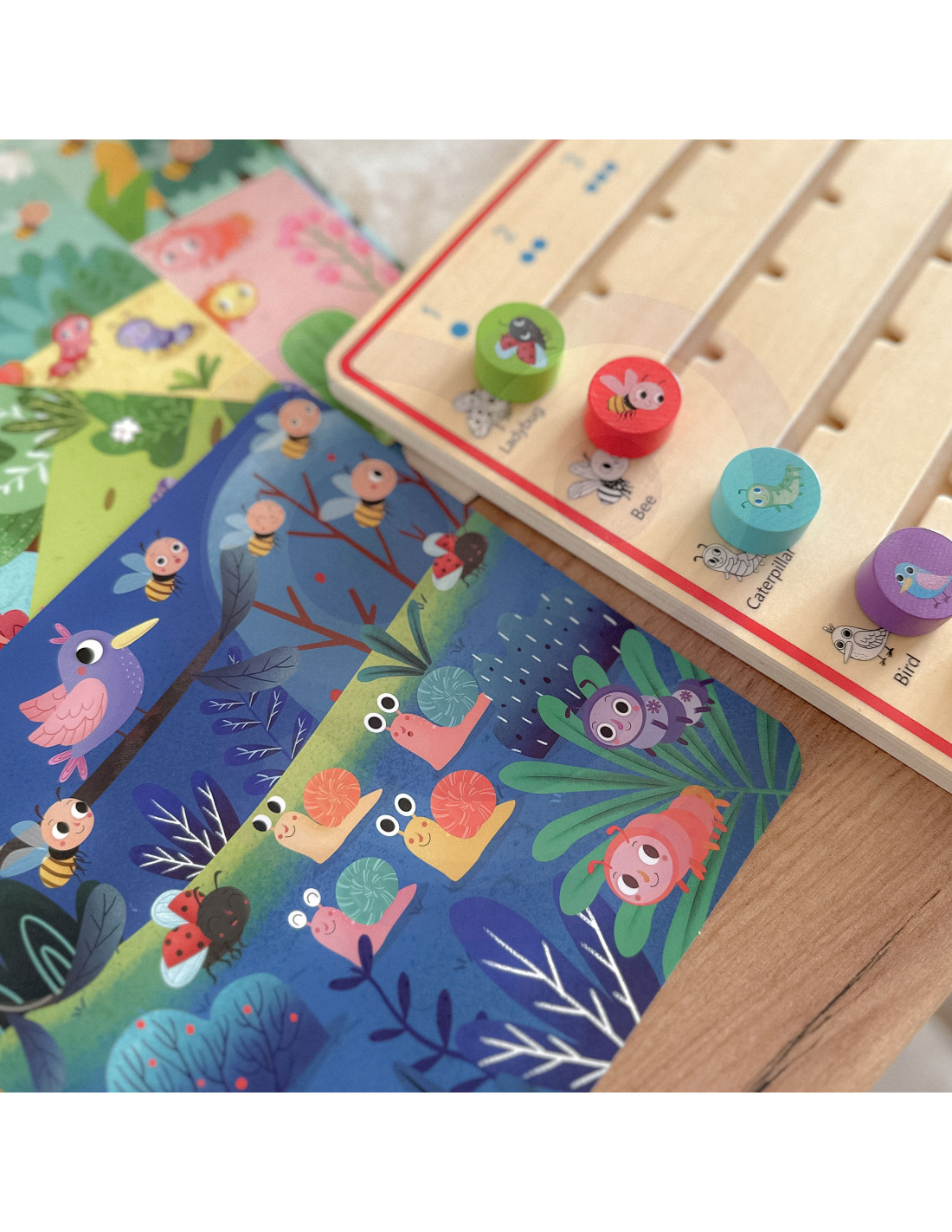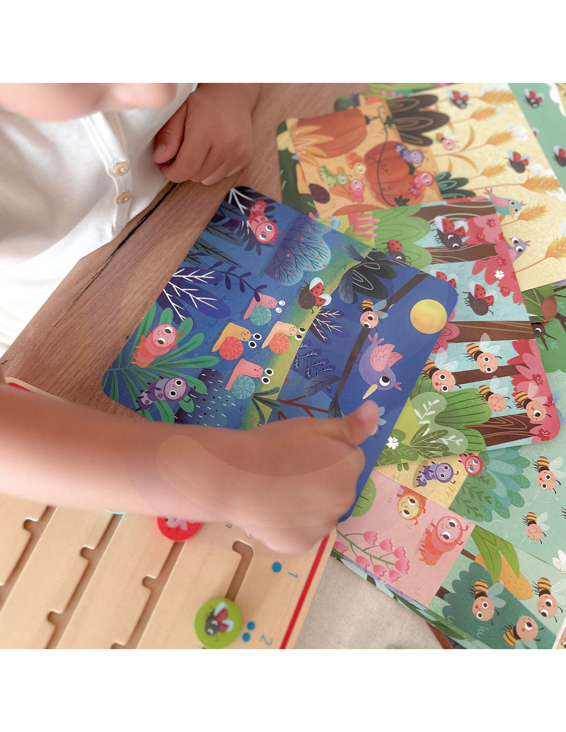 Wylosuj lub wybierz dowolną kartę i policzcie ile jest zwierzątek. Na odwrocie kart znajdziecie odpowiedzi do zadania, dzięki temu dziecko może grać także samodzielnie. Na drewnianej tabliczce znajdziecie pinezkę z biedronką, pszczółką, ślimakiem, ptaszkiem lub gąsienicą i zaznaczcie ile jest ich na obrazku. Poćwiczcie przy tym polskie i angielskie nazwy zwierzątek.
