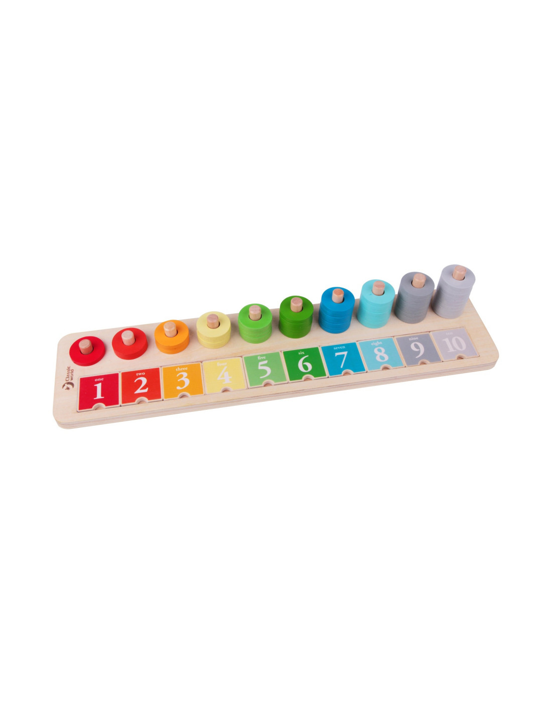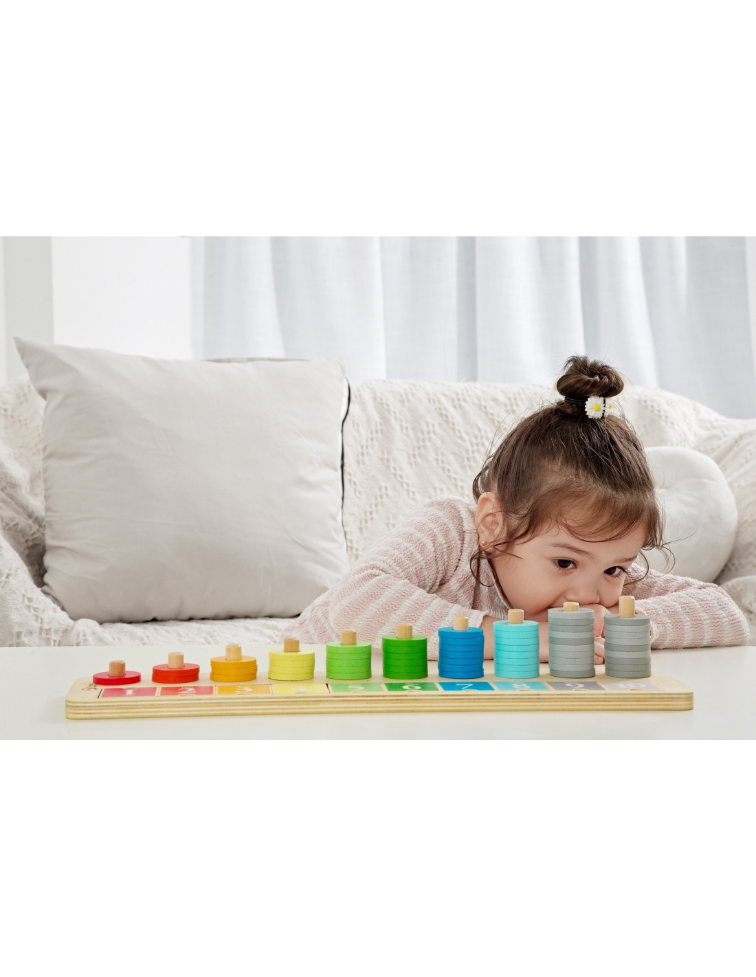 Układanka od Classic World to drewniany sorter do rozpoznawania kolorów i nauki liczenia. Zabawa polega na dopasowaniu ilości nałożonych kółek do cyferek namalowanych na podstawce. Pod cyferkami znajdziemy również narysowane kropeczki które również mogą pomóc, aby twoja pociecha mogla dopasować odpowiednio klocki. Podczas zabawy dziecko ćwiczy zdolności manualne, rozwija umiejętności logicznego myślenia, koordynację ręka – oko, uczy rozpoznawania kolorów oraz pojęcia większy – mniejszy. Możemy liczby ustawić po kolei, lub pomieszać je by utrudnić układanie.