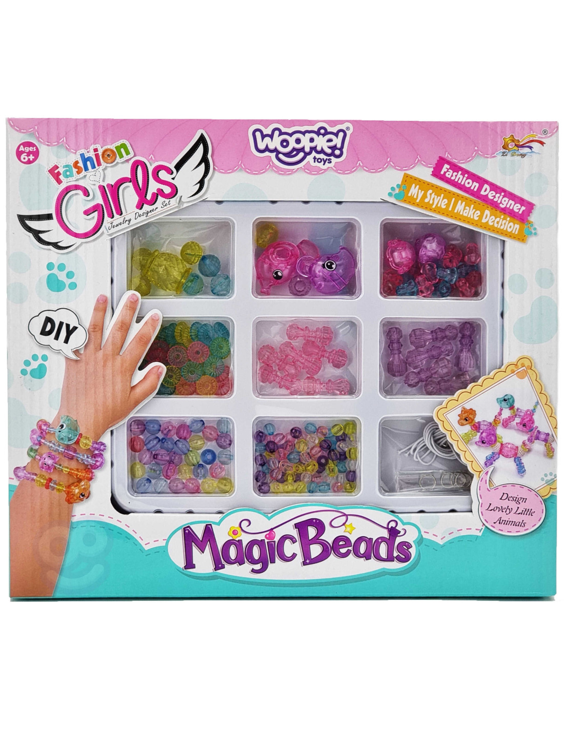 Zestaw do Robienia Biżuterii z motywem Zwierząt od marki WOOPIE jest stylowym, kreatywnym i zjawiskowym zestawem dla każdego dziecka. Dziecko samodzielnie może mieszać i dopasowywać różne koraliki oraz zawieszki, aby stworzyć swoją niepowtarzalną bransoletkę, pierścionek, kolczyki lub wisiorek. Wszystko można wykonać z motywem zwierząt. Zestaw zawiera różnego rodzaju elementy: koraliki różnej wielkości, zawieszki, elementy przypominające zwierzątka, oraz żyłki. Komplet zapakowany jest w kolorowe pudełko z wygodnym uchwytem do przenoszenia idealne na prezent. Po rozpakowaniu zestaw jest łatwo przenośny jest lekki i poręczny, co sprawia, że dziecko z łatwością może go zabrać ze sobą do przedszkola, do kolegi, do ogrodu. Opakowanie, również posiada formę organizera, co pozwoli na bezpieczne przechowywanie małych elementów znajdujących się w zestawie. Zabawa w tworzenie biżuterii pozytywnie wpływa na rozwój dziecka, kształtuje jego zdolności plastyczne wraz z rozwojem wyobraźni oraz kreatywności, ćwicząc jednocześnie koncentrację; rozwija zdolności manualne/motoryczne tzw. "małą motorykę" (ruch rączek), a także przy zabawie z przyjaciółmi uczy współpracy, dzielenia się i usprawnia zdolności społeczno-integracyjne.