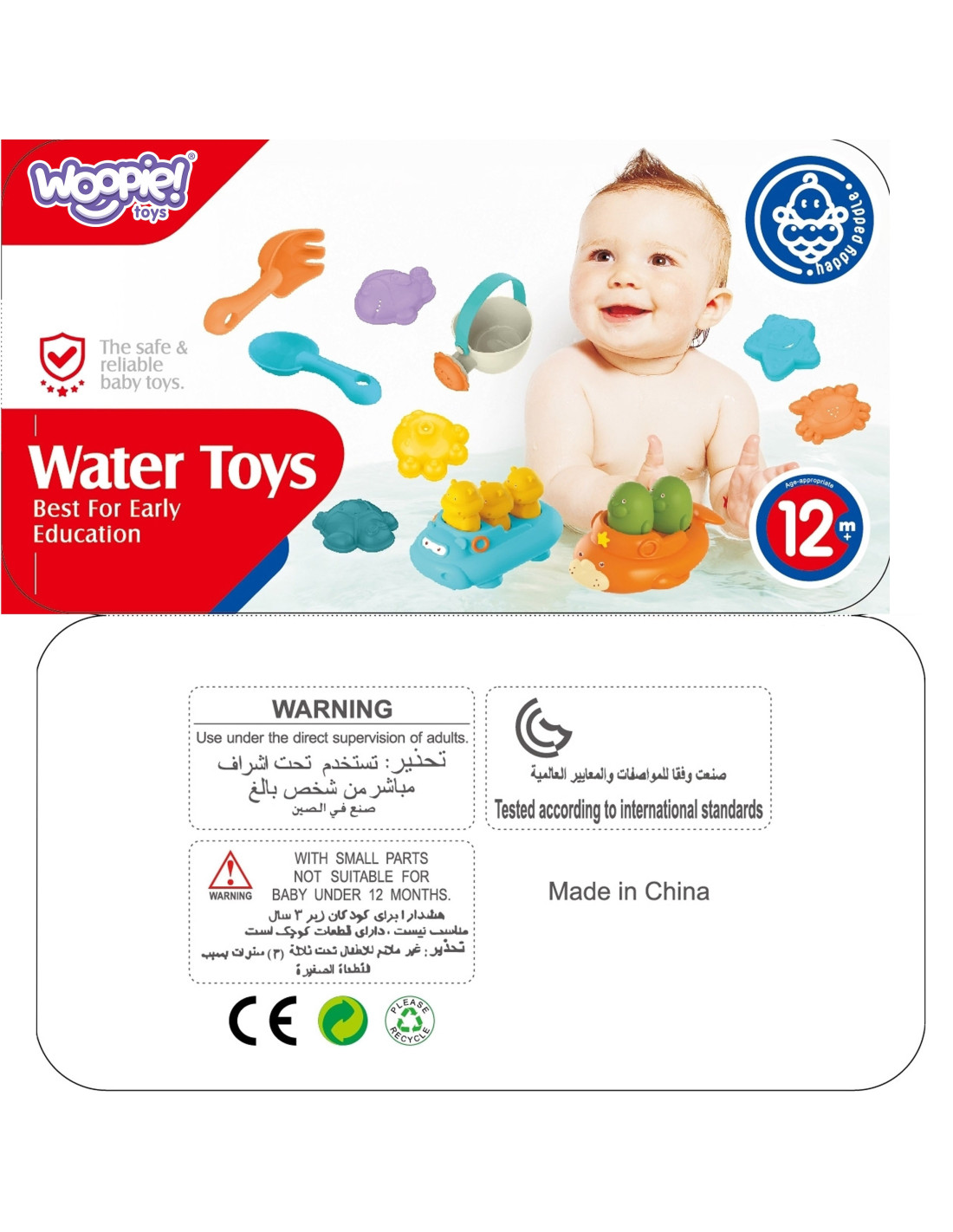 Zestaw zabawek wodnych od marki WOOPIE będzie super uzupełnieniem kąpieli dla Twojego dziecka. Zestaw można używać zarówno podczas kąpieli oraz do zabawy w piasku. Zestaw zawiera: siatkę do łowienia; 3 łódki; 4 kubeczki, które można ze sobą złożyć; 5 foremek/ kubeczków przelewowych w zależności , czy zabawa jest w wodzie czy w piasku oraz 2 łopatki. Dziecko podczas zabawy w czasie kąpieli może przeprowadzić szereg różnych doświadczeń! Zestaw nie tylko umili czas podczas kąpieli lub zabawy w piaskownicy, ale również rozwinie zdolności manualne u dziecka oraz rozwinie świadomość otaczającego go świata, a przede wszystkim pozwoli dziecku skoncentrować się i zająć czymś podczas mycia.