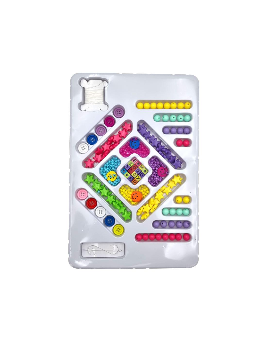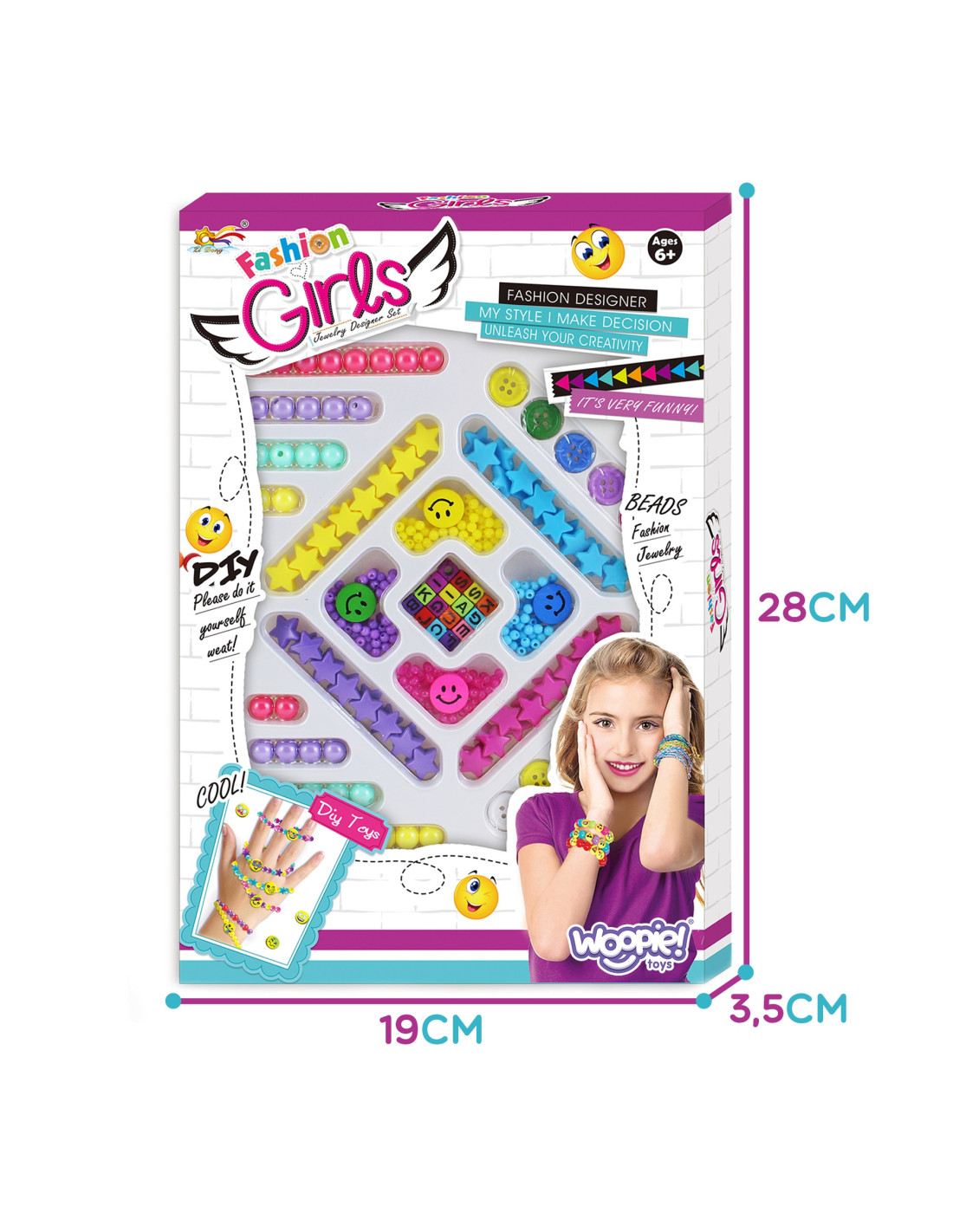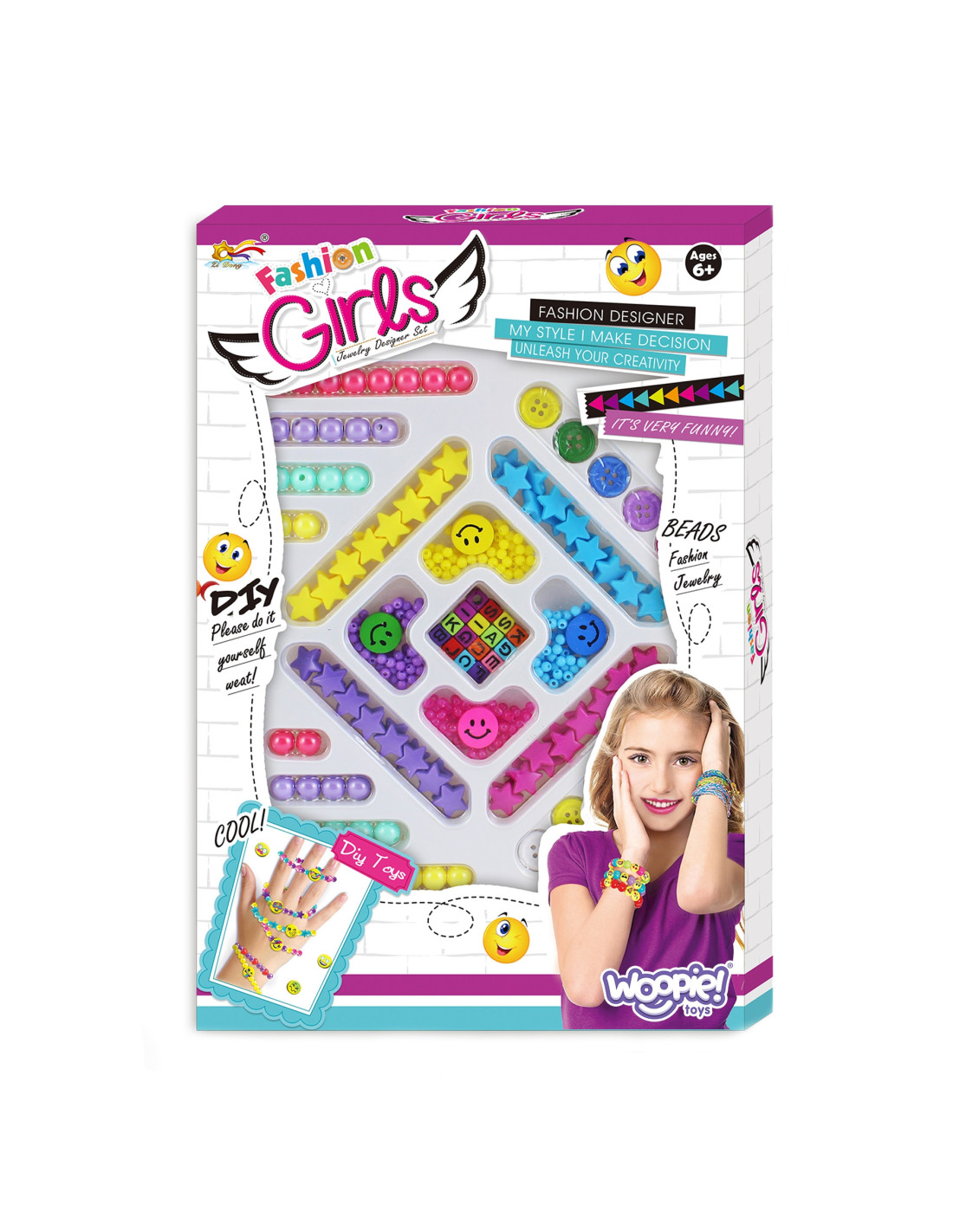 Zestaw do Robienia Biżuterii od marki WOOPIE jest stylowym, kreatywnym i zjawiskowym zestawem dla każdego dziecka. Dziecko samodzielnie może mieszać i dopasowywać różne koraliki oraz zawieszki, aby stworzyć swoja niepowtarzalna bransoletkę lub wisiorek. Zestaw zawiera różnego rodzaju elementy: koraliki różnej wielkości, guziki, gwiazdki, uśmiechy, koraliki z literkami oraz żyłki. Komplet zapakowany jest w kolorowe pudełko idealne na prezent. Po rozpakowaniu zestaw jest łatwo przenośny jest lekki i poręczny, co sprawia, że dziecko z łatwością może go zabrać ze sobą do przedszkola, do kolegi, do ogrodu. Opakowanie, również posiada formę organizera, co pozwoli na bezpieczne przechowywanie małych elementów znajdujących się w zestawie. Zabawa w tworzenie biżuterii pozytywnie wpływa na rozwój dziecka, kształtuje jego zdolności plastyczne wraz z rozwojem wyobraźni oraz kreatywności, ćwicząc jednocześnie koncentrację; rozwija zdolności manualne/motoryczne tzw. "małą motorykę" (ruch rączek), a także przy zabawie z przyjaciółmi uczy współpracy, dzielenia się i usprawnia zdolności społeczno-integracyjne.