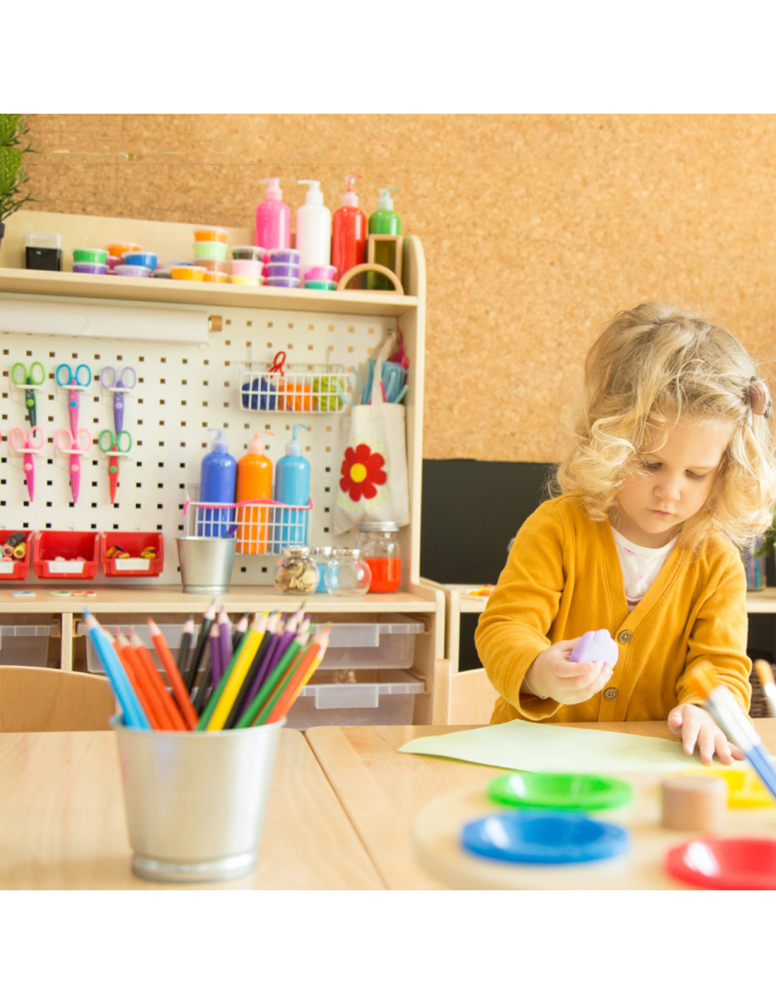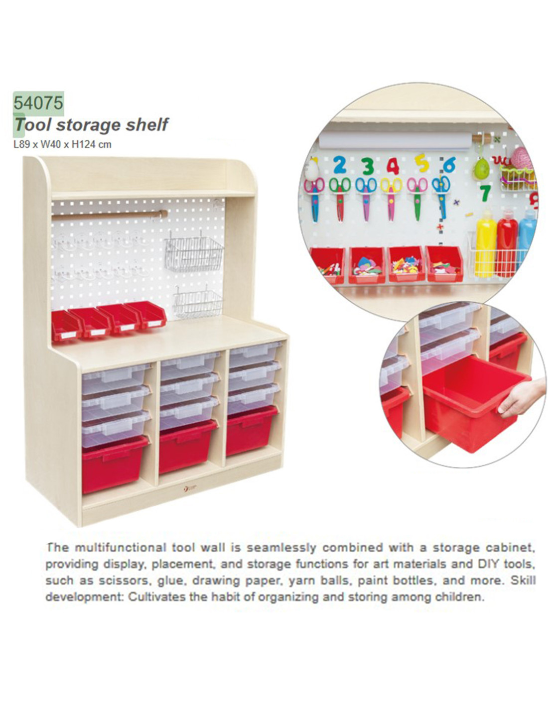 Szafka Plastyczna na Przybory od marki CLASSIC WORLD z serii EDU doskonale łączy ścianę narzędziową oraz szuflady na przybory plastyczne. Może zarówno pokazywać, jak i przechowywać materiały artystyczne i narzędzia do majsterkowania, takie jak nożyczki, klej, papier do rysowania i pojemniki z farbami. Wszystko w jednym miejscu!