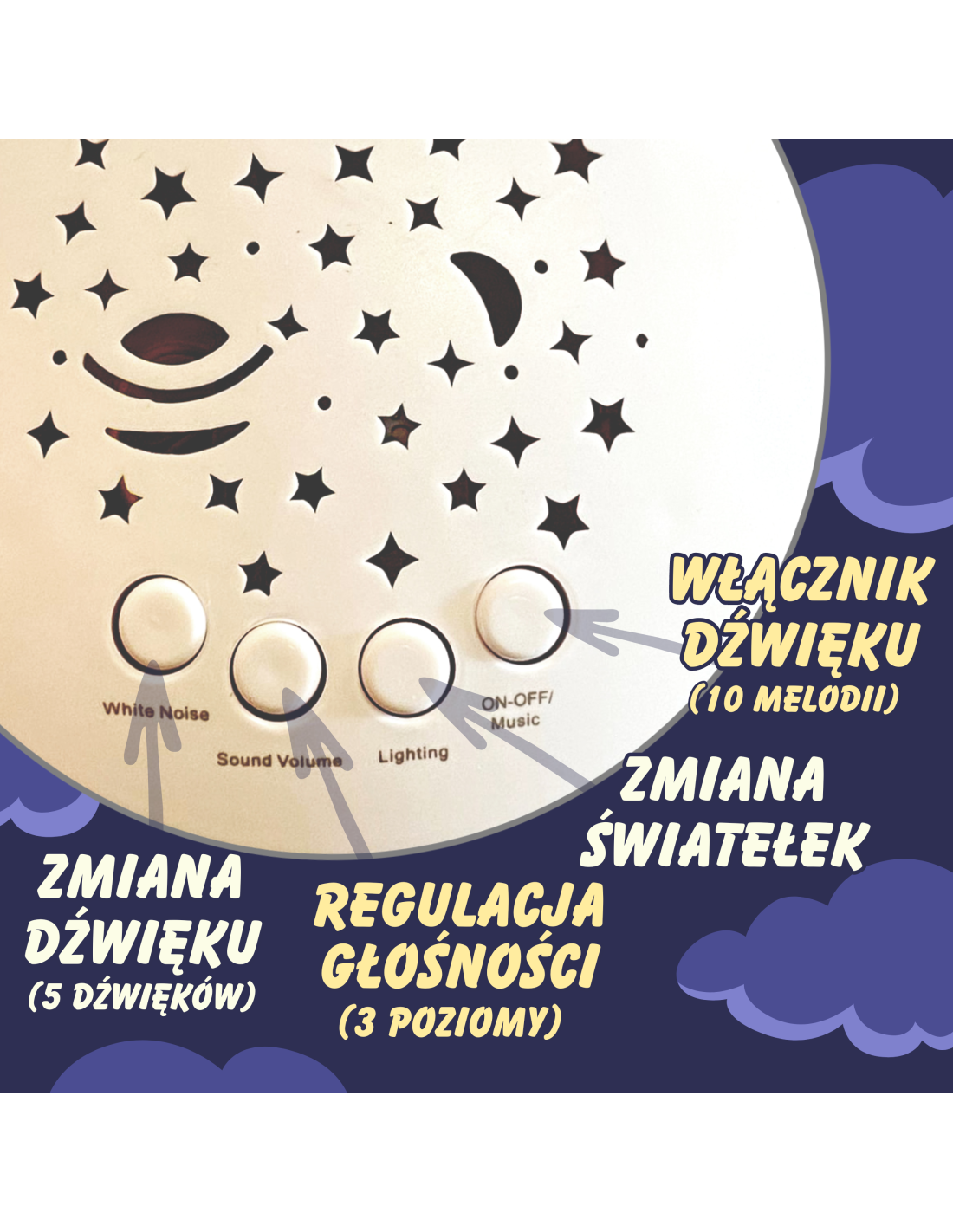 - - efekty świetlne i dźwiękowe - melodie/kołysanki pomagające zasnąć + projektor zmieniający kolory,