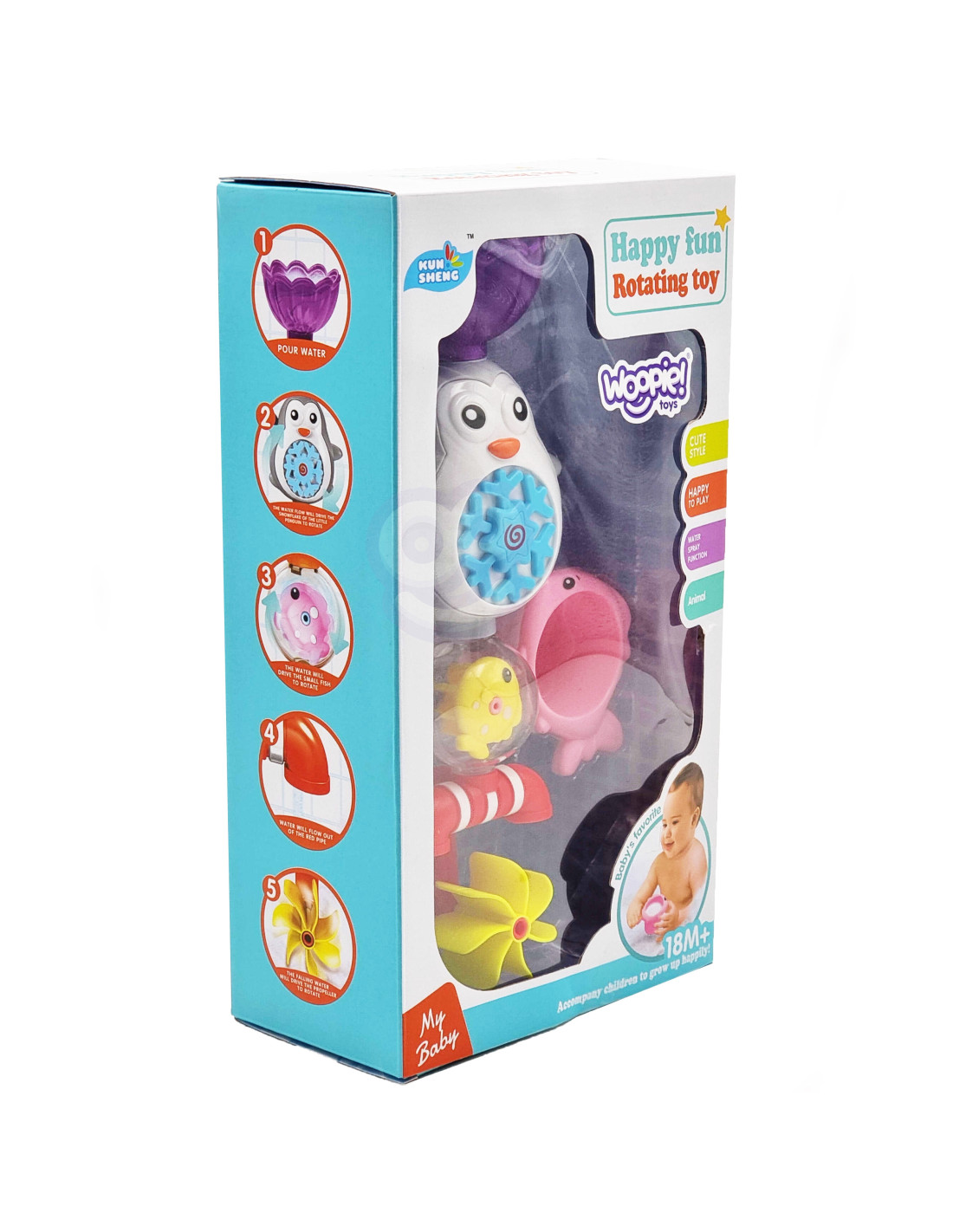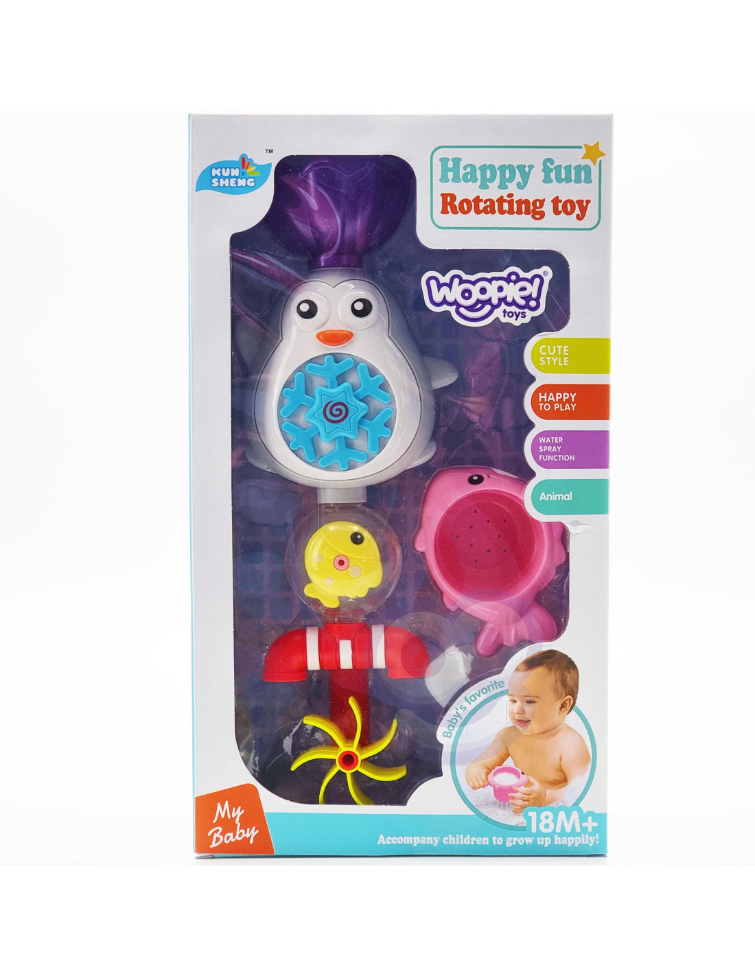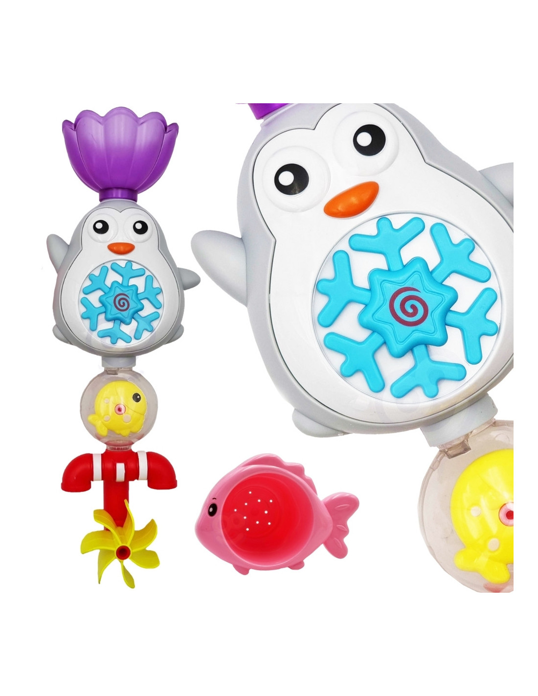 Zabawka Wodna Pingwin od marki WOOPIE zapewni ciekawy czas dla dziecka podczas kąpieli. Dziecko za pomocą kubeczka wlewa do czapki pingwina wodę. Podczas wlewania wody element na brzuchu (płatek śniegu) obraca się w kółko, niżej położona rybka również, a woda trafia do wanny poprzez 2 kraniki oraz kręcący się kołowrotek. Kubeczek posiada funkcję kubka przelewowego, który zwraca uwagę oraz rozwija zmysły malucha. Dodatkowo posiada 2 przyssawki, dzięki czemu można przyczepić ją do ściany w łazience lub do wanny. Zabawka nie tylko umili czas podczas kąpieli, ale również rozwinie wyobraźnię u dziecka oraz rozwinie świadomość otaczającego go świata, a przede wszystkim pozwoli dziecku skoncentrować się i zająć czymś podczas mycia.