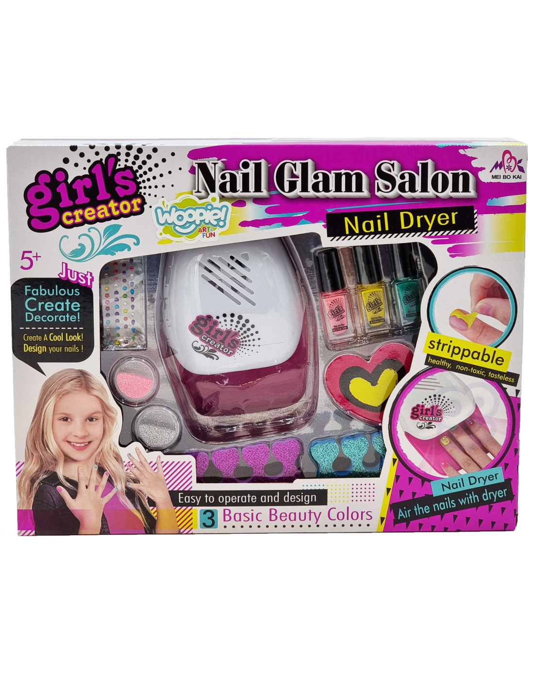 Zestaw do Malowania Paznokci od marki WOOPIE z serii ART&FUN wprowadzi dziewczynki w świat mody i pozwoli wykreować swój własny styl! Zestaw wygląda jak w prawdziwym salonie urody. Zestaw zawiera: 3 lakiery do paznokci, 2 brokaty sypkie, zestaw naklejek, 2 brokatowe separatory, pilnik-serce oraz suszarkę do paznokci. Wystarczy nanieść lakier, dodatki, a po wszystkim wysuszyć suszarką i gotowe! Zestaw w 100% bezpieczny dla dzieci. Zestaw rozwija pierwsze zainteresowania, zdolności manualne, a przede wszystkim wyobraźnie i kreatywność w tworzeniu unikalnego stylu!