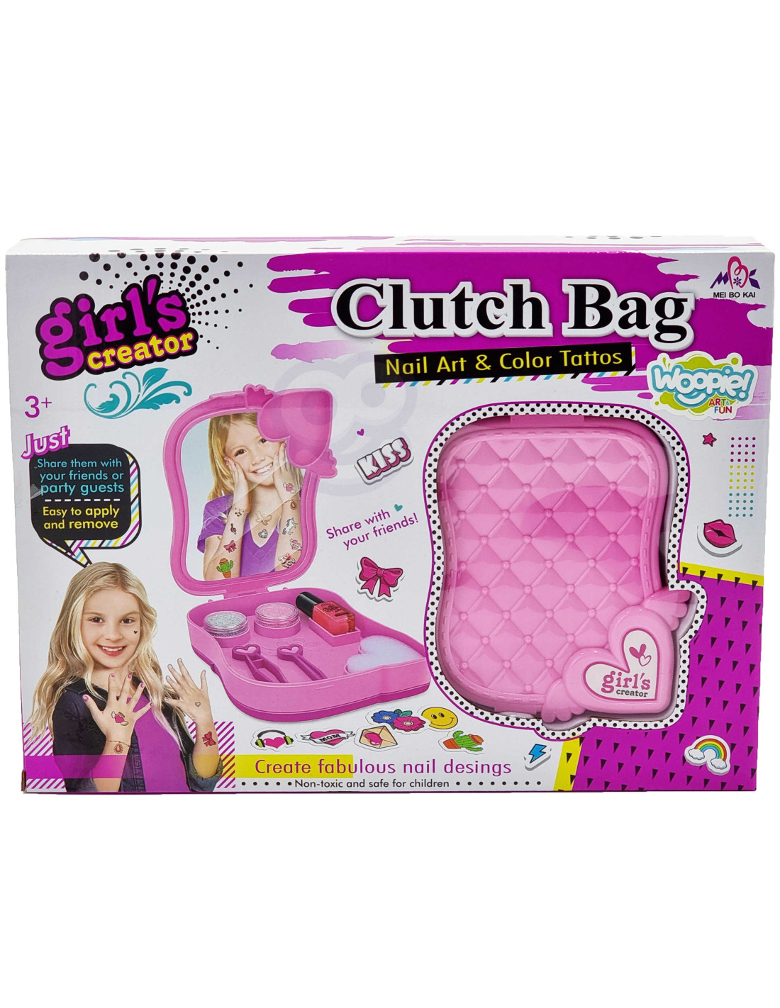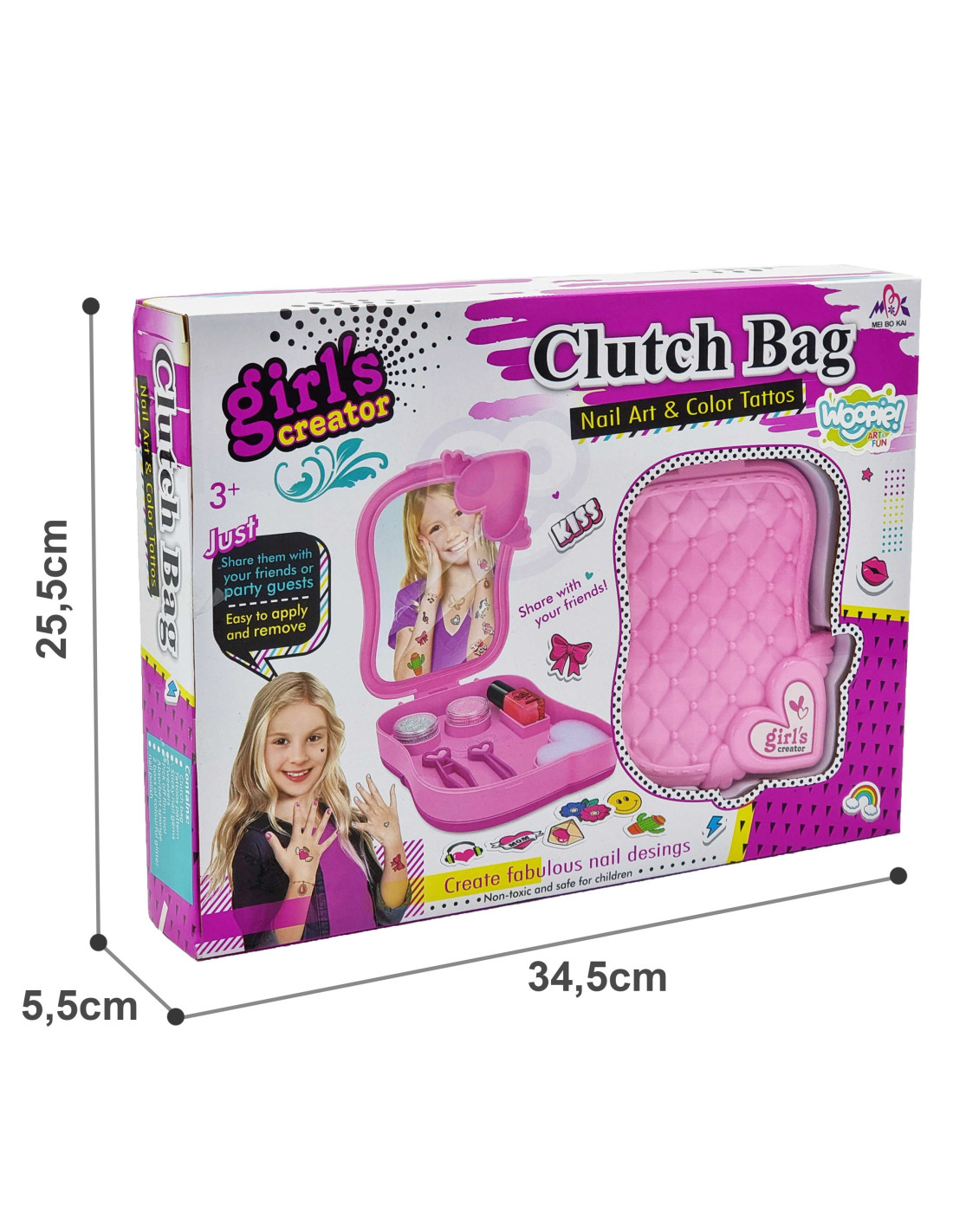Zestaw do Malowania Studio Makijażu od marki WOOPIE z serii ART&FUN wprowadzi dziewczynki w świat mody i pozwoli wykreować swój własny styl! Zestaw wygląda jak w prawdziwym salonie urody. Zestaw zawiera: toaletkę, 2 brokaty sypkie, zestaw naklejek i tatuaży, lakier, pilnik-serce, pęsetę oraz dłutko. Wystarczy nanieść lakier i naklejki na paznokcie oraz tatuaże na skórę, a po wszystkim wysuszyć i gotowe! Zestaw w 100% bezpieczny dla dzieci. Zestaw rozwija pierwsze zainteresowania, zdolności manualne, a przede wszystkim wyobraźnie i kreatywność w tworzeniu unikalnego stylu!