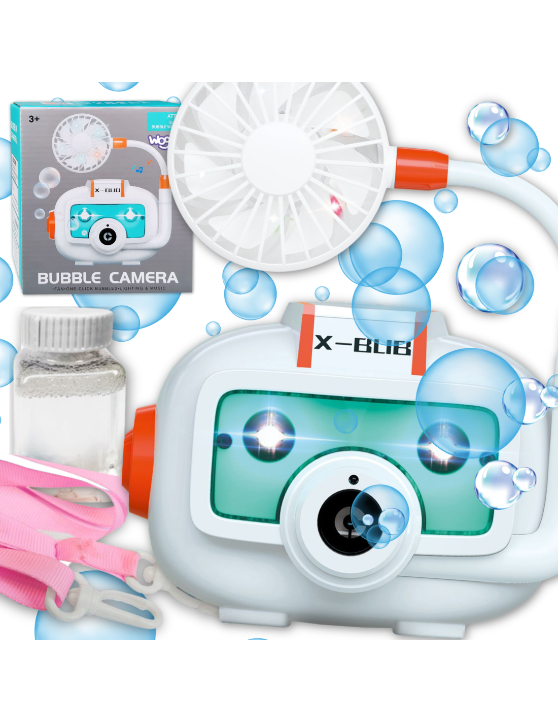 Maszyna do robienia baniek w kształcie aparatu marki Woopie to świetna zabawka dla dzieci. Aparat ma wiele funkcji- nie tylko puszcza bańki, ale ma też światełka, które wyglądają jak flesz od aparatu, wiatraczek, który swoim podmuchem posyła bańki dalej oraz przyjemną dla ucha melodyjkę, która dodatkowo umila czas. Dzieci mogą pozować do zdjęć, a potem zbijać bańki wspólnie. Znajdziemy również pojemniczek na płyn na bańki oraz smycz aby zawiesić sobie aparat na szyi.