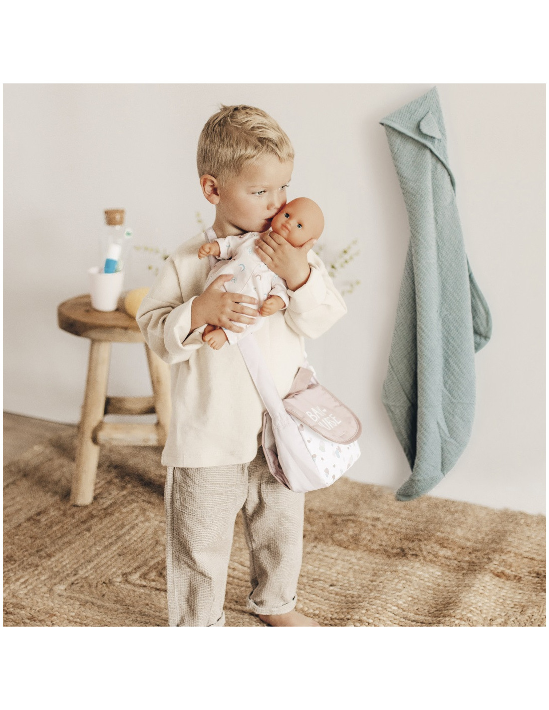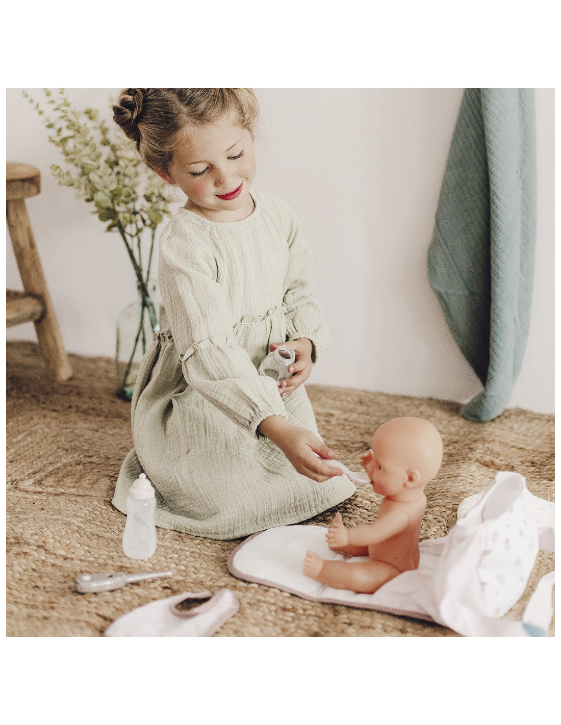 - - w zestawie 7 akcesoriów - pieluszka, śliniaczek, termometr, buteleczka do karmienia, łyżeczka i 2 pojemniczki (syrop i mydełko),