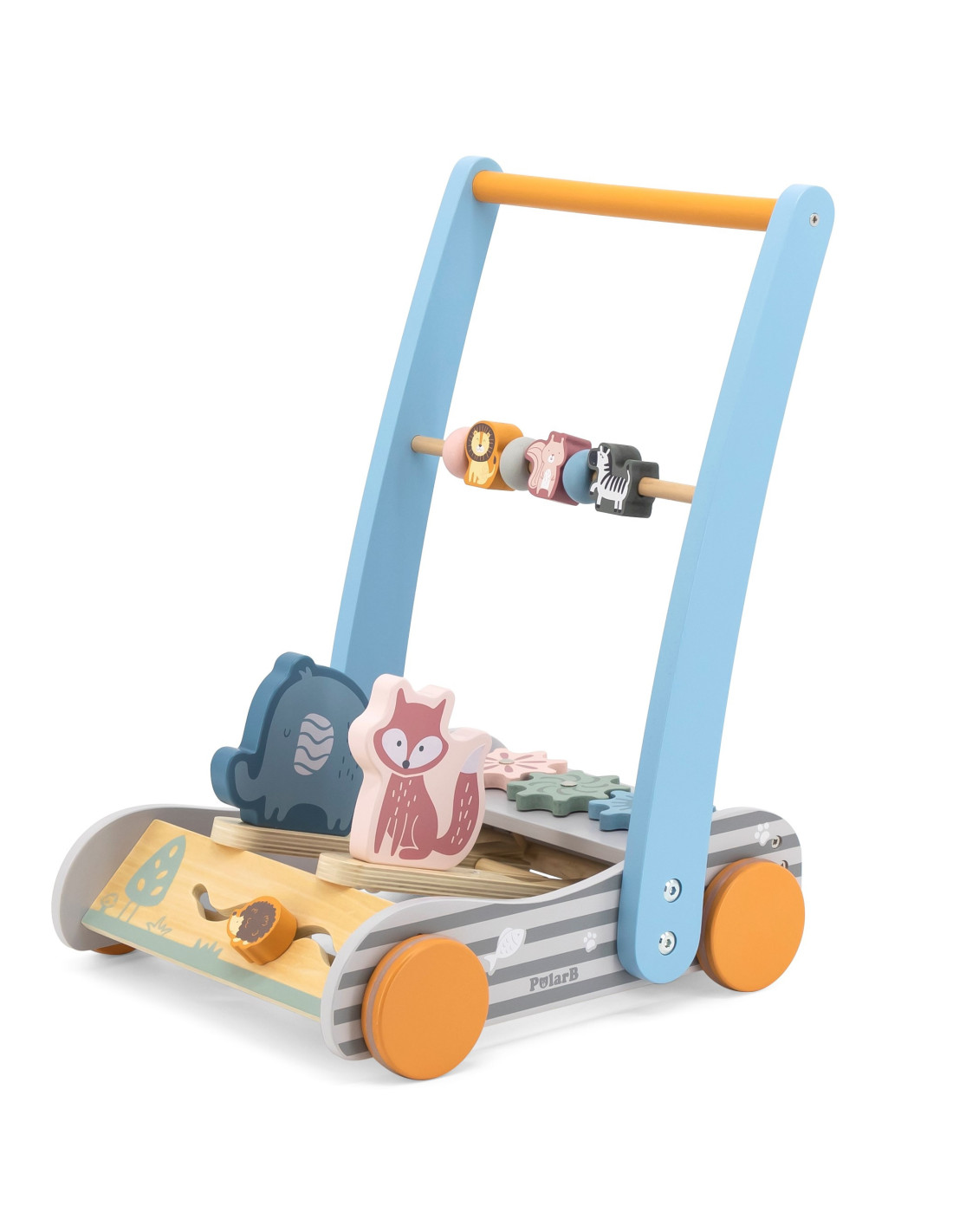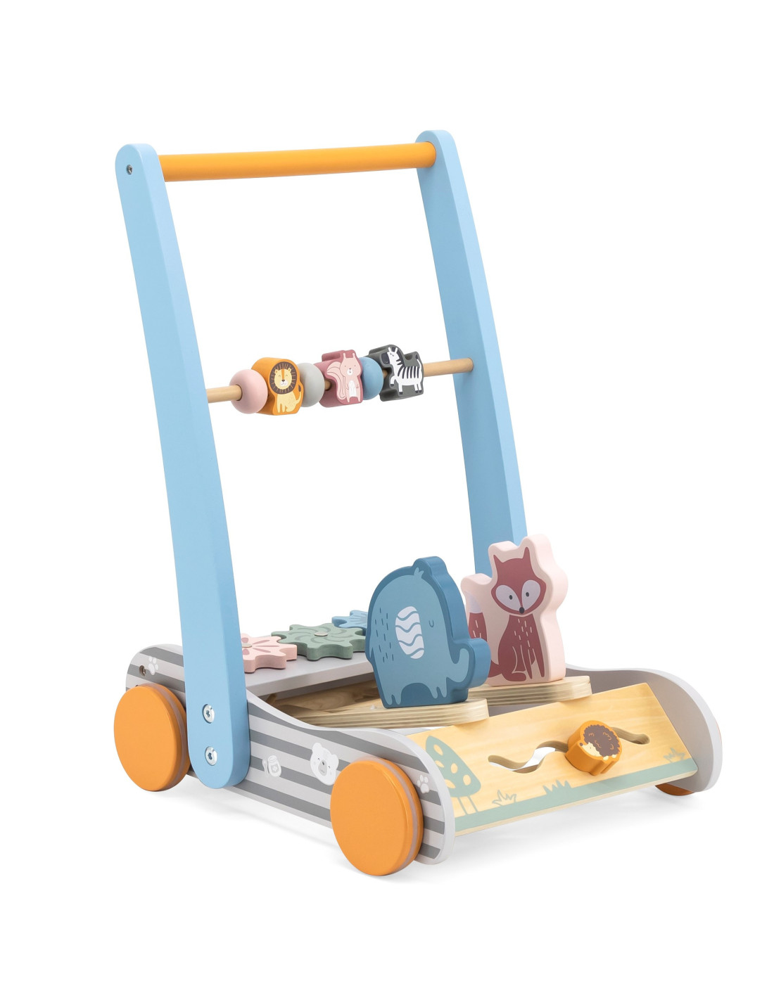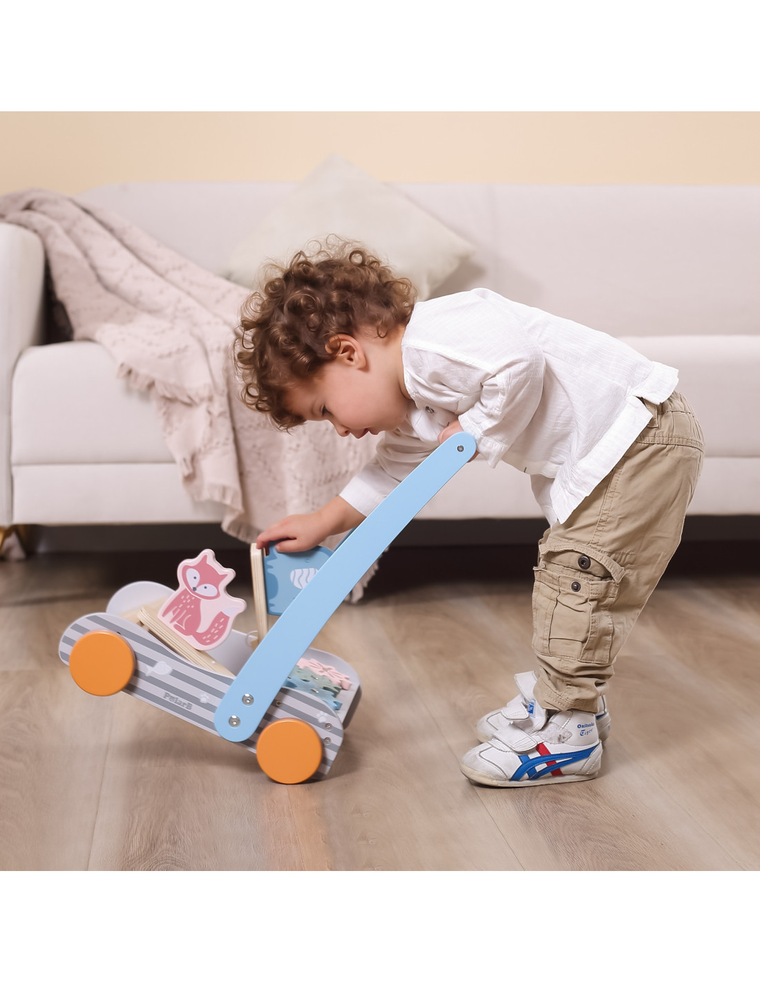 Na rączce pchacza umieszczone są klocki z różnymi kształtami, które pomagają rozwinąć znajomość kolorów i zwierząt. Przesuwając pchacz do przodu lis i słoń huśtają się w górę i w dół, wydając dźwięk, co dodaje frajdy podczas chodzenia. Dzięki temu chodzikowi będziesz mógł zaobserwować jak Twoje dziecko nabiera nowych sprawności ruchowych. Zabawka rozwija zdolności poprzez zabawę!