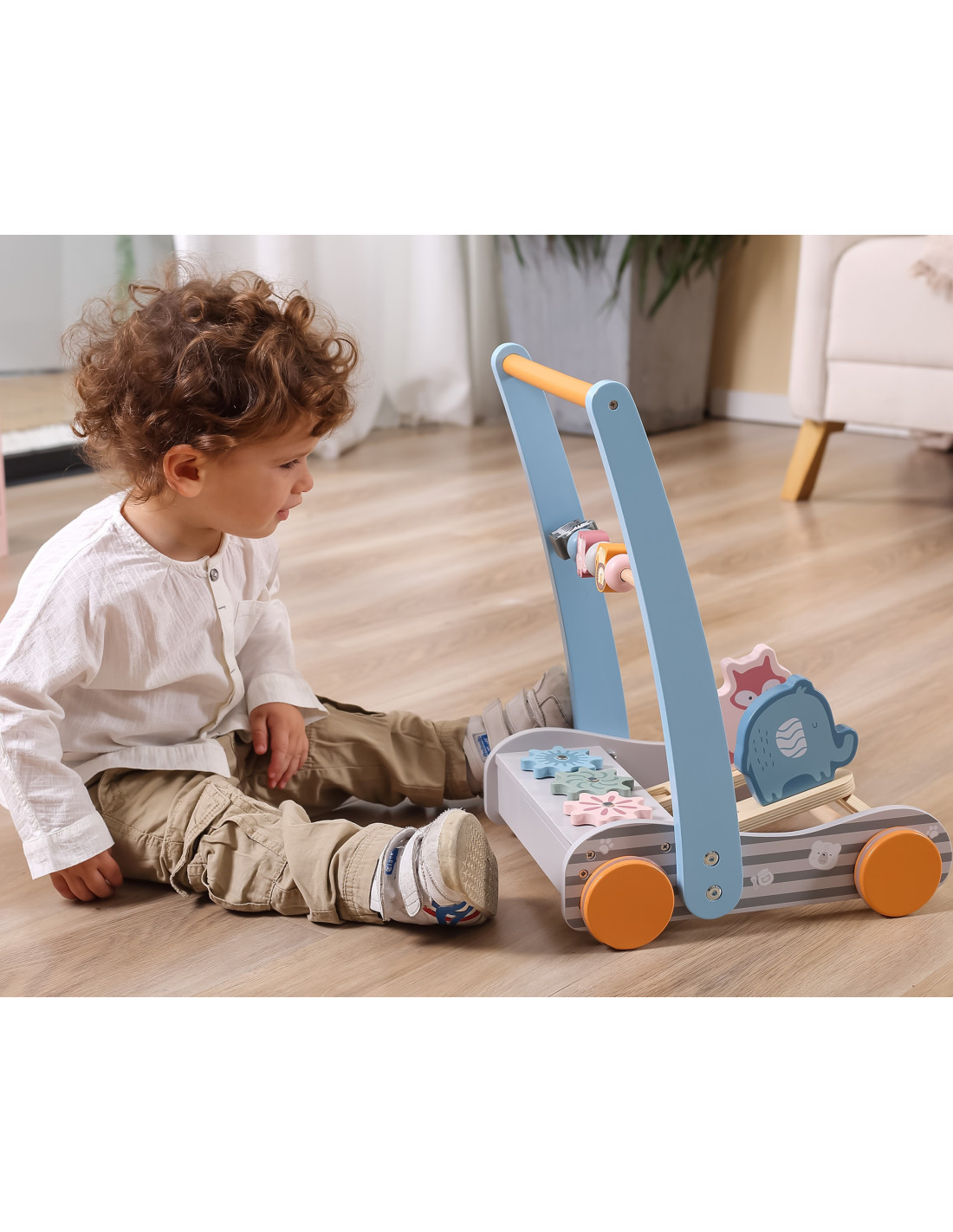 Chodziki należą do najczęściej wybieranych zabawek dla dzieci, które rozpoczynają stawianie pierwszych kroków. Spacer z chodzikiem to prawdziwa przyjemność, ułatwia utrzymanie równowagi podczas doskonalenia chodzenia. Kółka wózeczka posiadają gumowe osłonki co na ma celu, tłumienie odgłosów oraz właściwości antypoślizgowe. Całość została wykonana z najwyższej jakości drewna bukowego.