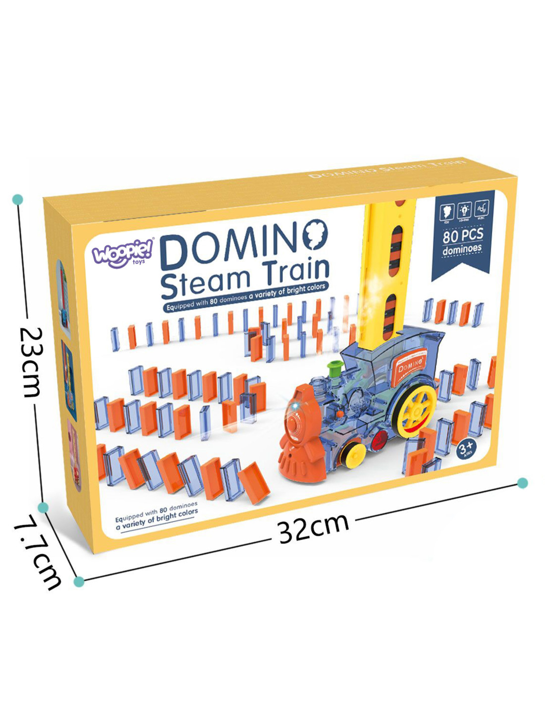 Elektryczna Ciuchcia Lokomotywa do Klocków Domino z Parą od marki WOOPIE zachwyci każde dziecko. Pociąg posiada wiele fantastycznych funkcji. Wystarczy naładować magazynek klockami, umieścić w ciuchci, wcisnąć guzik i pociąg rusza wydając dźwięk i świecąc oraz pozostawiając automatycznie za sobą klocki w układzie domino. Guzikiem można zarówno włączyć i wyłączyć ciuchcie, a kominem z góry skręcać. Wystarczy umieścić w specjalnym miejscu wodę i lokomotywa będzie również puszczała dym jak z prawdziwej lokomotywy. Młodsze dzieci lubią natychmiast przewracać klocki, natomiast starsze zaciekawi przewracanie klocków w całym efekcie domina. Zestaw zawiera aż 80 elementów. Zabawka nie tylko dostarczy świetnej zabawy, ale również uczy. Rozwija w dziecku związek przyczynowo-skutkowy, zdolności manualne oraz wspomaga koncentracje, wyobraźnie i kreatywność.