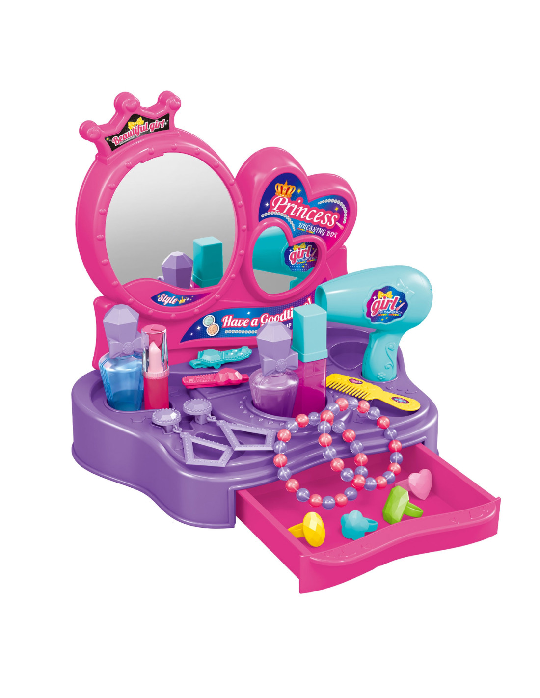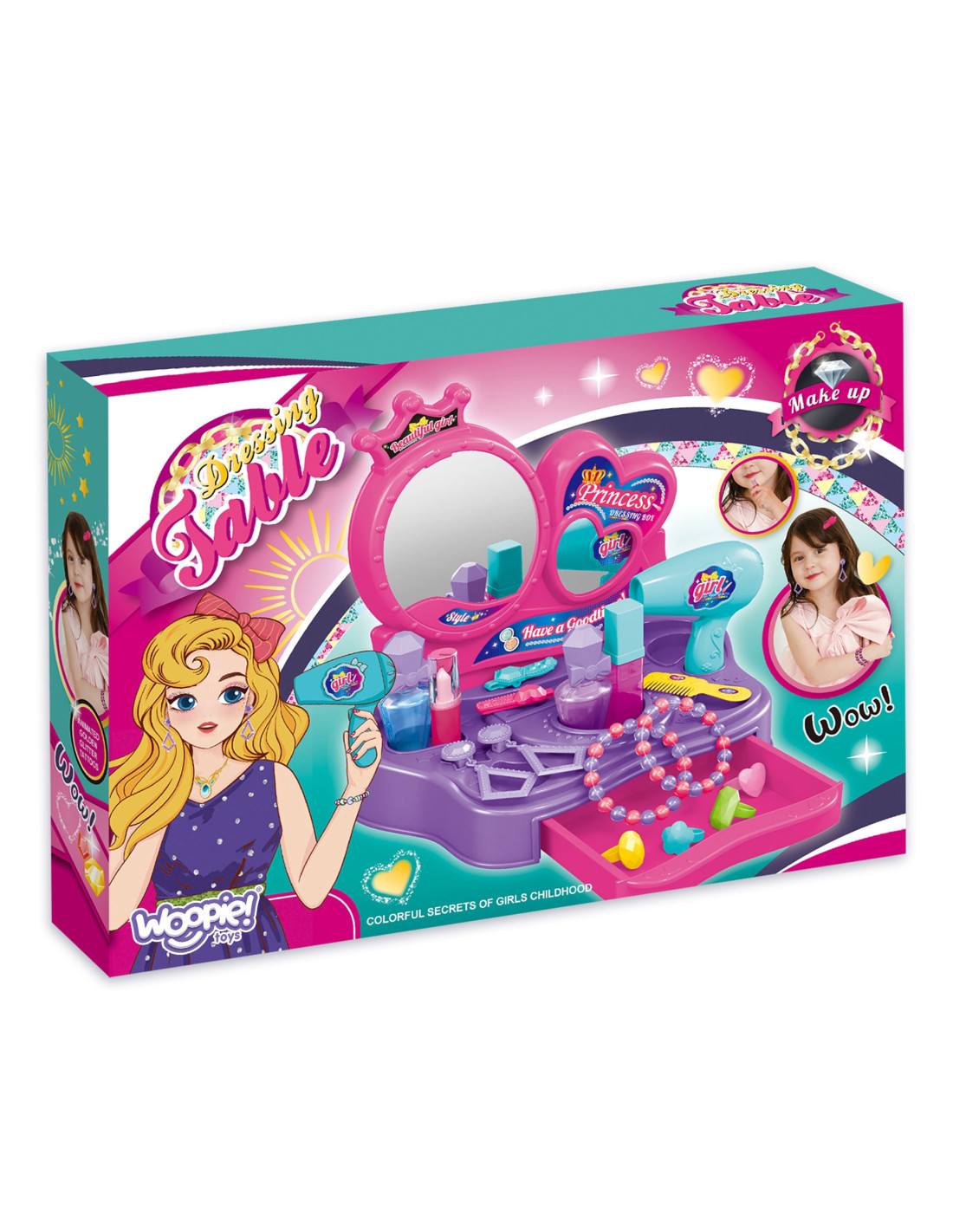 Toaletka Salon Urody od marki WOOPIE wprowadzi dzieci w świat mody i pozwoli wykreować swój własny styl! Zestaw wygląda jak w prawdziwym salonie urody. Zestaw zawiera: toaletkę, suszarkę, 4 pierścionki, 2 spinki, 2 branzoletki, grzebień, kolczyki, 2 perfumy, lakier i szminkę. Zestaw rozwija pierwsze zainteresowania, zdolności manualne, a przede wszystkim wyobraźnie i kreatywność w tworzeniu unikalnego stylu!