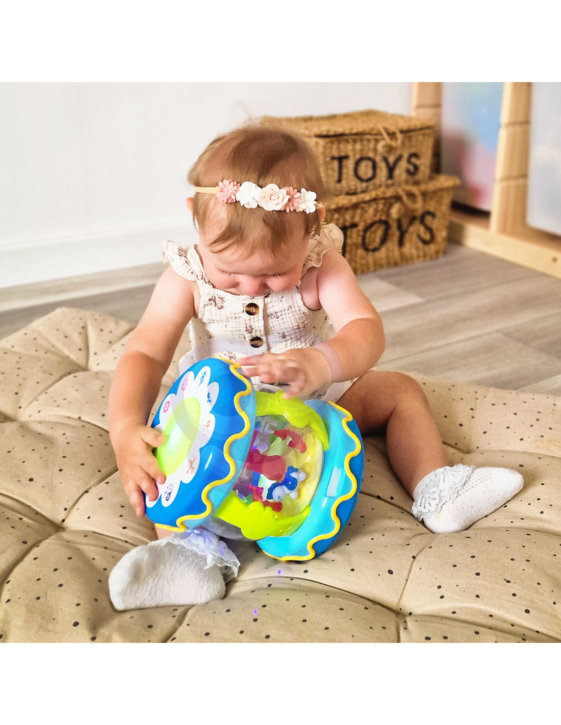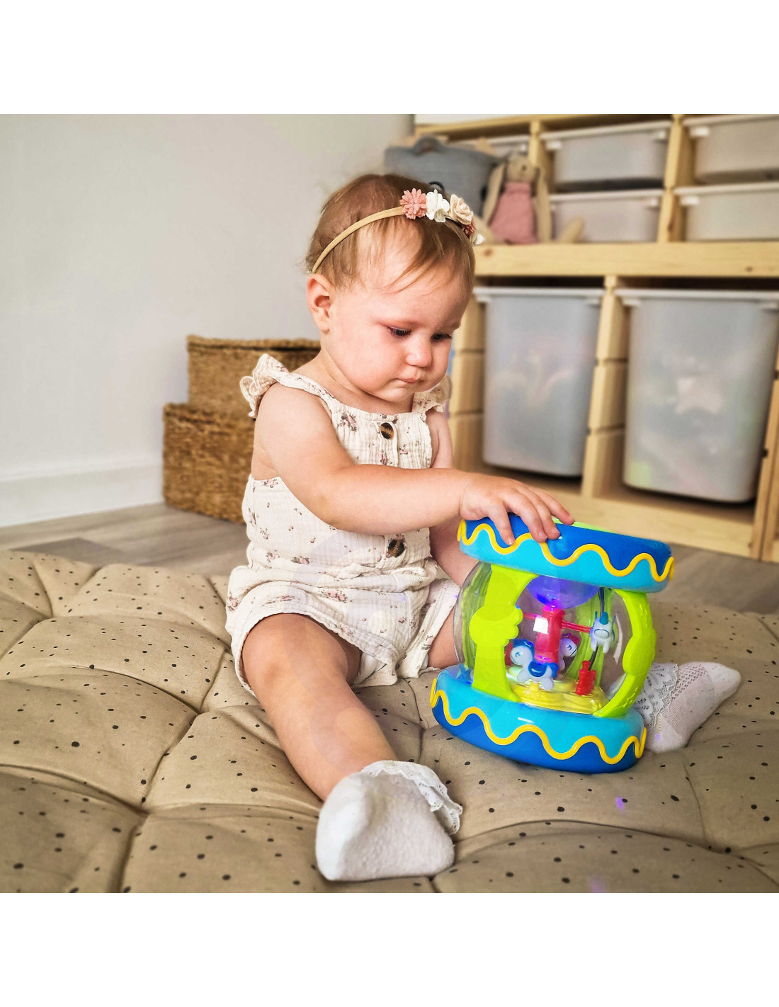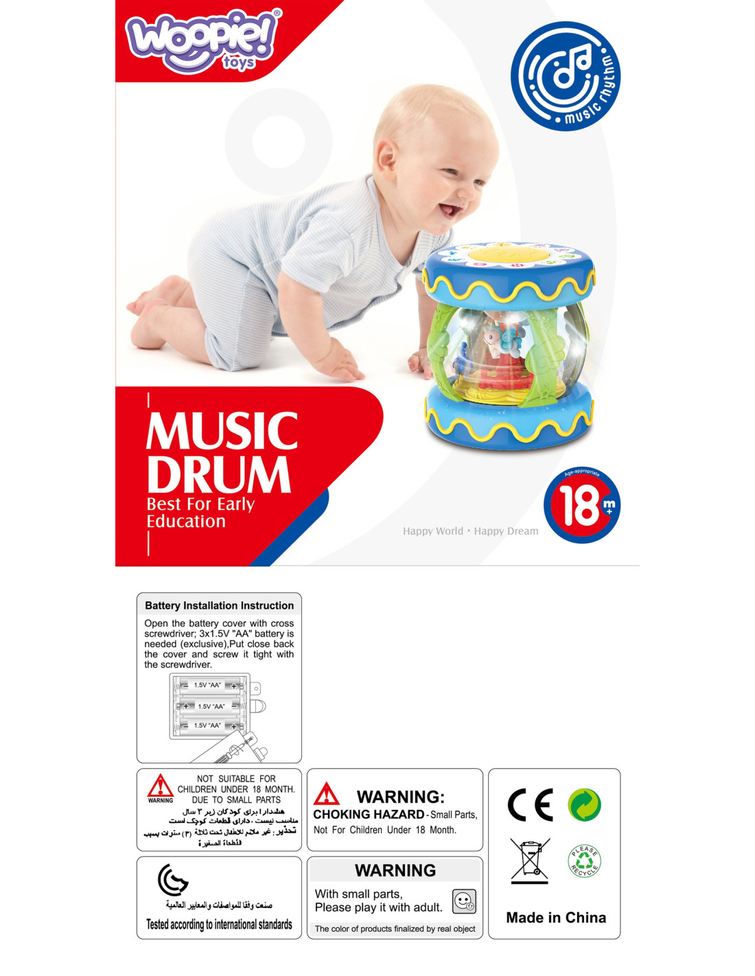 Muzyczny Bębenek Pozytywka od marki WOOPIE to zabawka potrzebna każdemu dziecku. Zabawka ma na celu głównie rozwijania zmysłów oraz jako umilacz przy zasypianiu. zabawka działa, również jako pozytywka z kręcącymi się konikami w środku. Posiada 11 guzików dźwiękowych w tym duży bębenek. Podczas grania melodyjek światełka mrygają. W nocy zabawka pełni funkcje projektora - światełka świecą i imitują gwiazdy. Zabawka wysoce rozwija zmysły dziecka i koncentruję dziecko na długi czas.