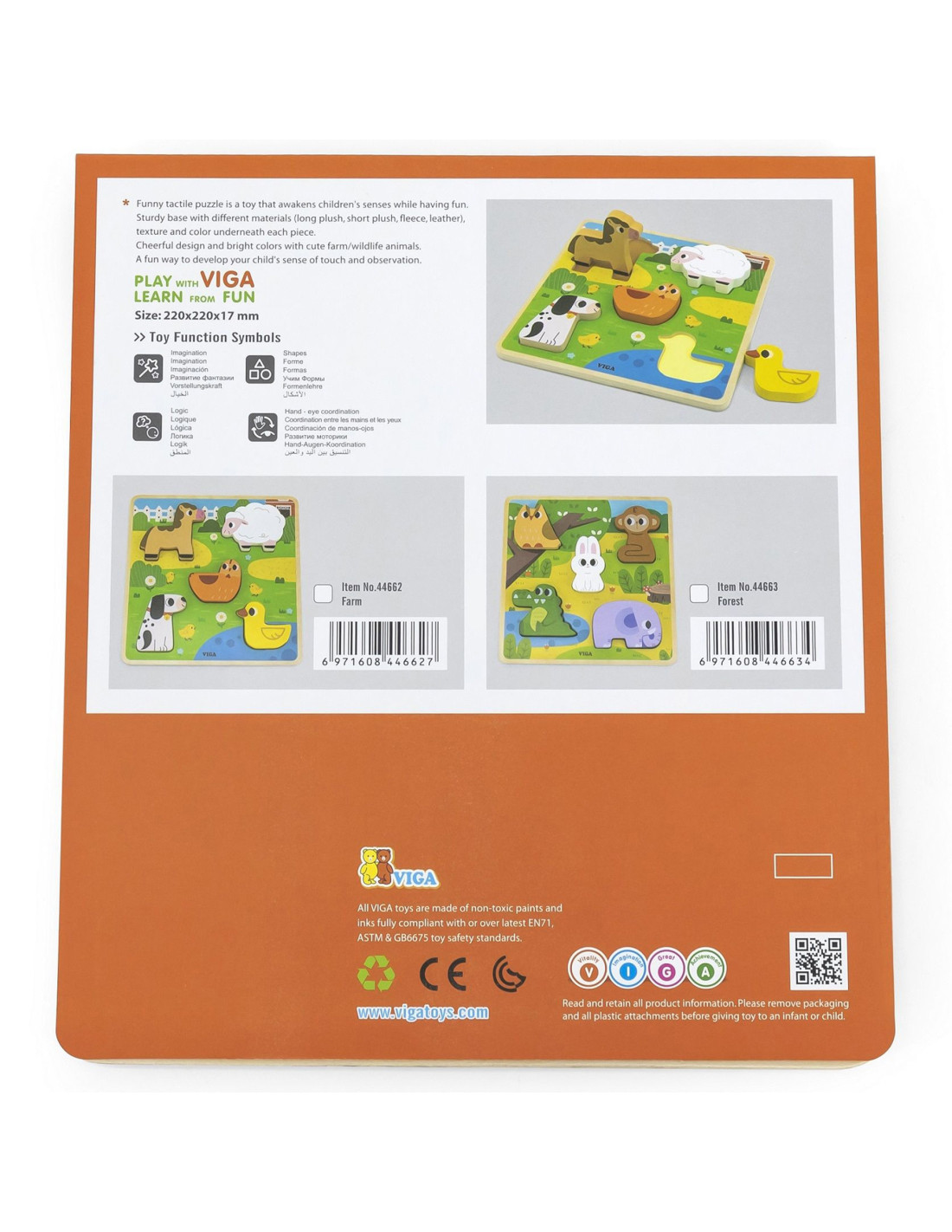 Klasyczne Drewniane Puzzle od marki VIGA w motywie farmy. W zestawie znajduje się kolorowa plansza oraz 5 elementów ze zwierzątkami. Zabawa polega na dopasowaniu kafelków zwierząt do odpowiednich miejsc na kolorowej podstawce. Taka zabawa pomoże kształtować precyzję ruchów rączek, oraz poprawić koordynację wzrokowo-ruchową, a także ćwiczyć pamięć, logiczne myślenie i koncentrację.