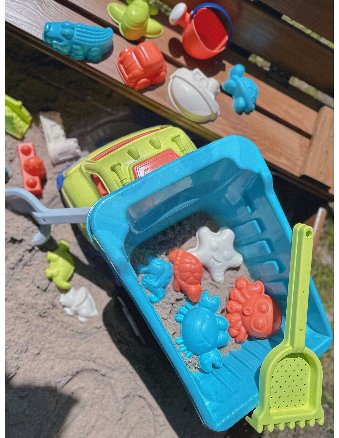 Zestaw do Piasku z Ciężarówką od marki WOOPIE to świetny dodatek do piaskownicy, a nawet ogrodu. Zestaw zawiera 20 elementów: samochodzik wywrotkę, grabki z sitkiem, łopatkę, konewkę i 16 foremek. Foremki przedstawiają budowle, pojazdy i zwierzątka wodne. Gwarancja super zabawy w piaskownicy, na plaży, a nawet w ogrodzie!