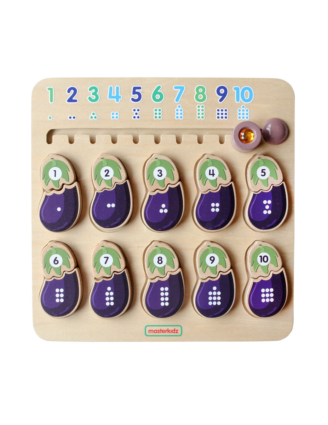 Drewniana tablica do nauki liczb i kolorów od marki MASTERKIDZ. Tablica została zaprojektowana, aby pomóc dzieciom rozwinąć ich zmysły. Dzieci muszą dopasować odpowiednie części bakłażana do siebie. Jedna cześć przedstawia liczbę, a druga odpowiednia ilość kropek. Na górze znajduje się suwak z dopasowanymi liczbami i kopkami w odpowiedniej kolejności. Układana rozwinie, również doskonale zdolności manualne u dziecka tzw. "małą motorykę".