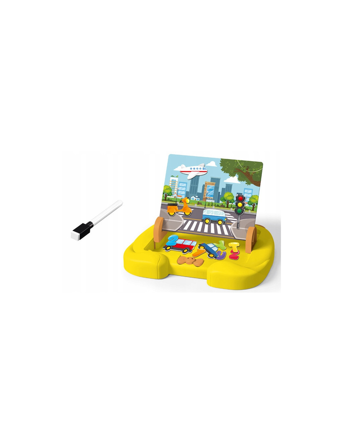 Odkryj Świat Edukacji z Tablicą Magnetyczną WOOPIE Środki Transportu! Stworzona z myślą o małych odkrywcach, ta innowacyjna tablica sprawi, że każde dziecko z radością weźmie udział w zabawach i ćwiczeniach, które rozwijają umiejętności nie tylko językowe, ale i matematyczne. Tablica wyróżnia się magnetyczną powierzchnią, która staje się idealnym miejscem do nauki przez zabawę. Dzięki dołączonym literom i cyfrom, dzieci mogą tworzyć słowa, układać zdania czy rozwiązywać proste równania. Co więcej, suchościeralna powierzchnia pozwala na wielokrotne rysowanie i pisanie, co zwiększa atrakcyjność zabawy. Bez potrzeby stosowania dodatkowych narzędzi, maluchy mogą w pełni skoncentrować się na odkrywaniu i eksperymentowaniu. Tablica nie tylko dostarcza radości, ale także znacząco wpływa na rozwój umiejętności manualnych oraz koordynacji wzrokowo-ruchowej. Dzieci uczą się logicznego myślenia, a także rozwijają zdolności społeczne poprzez wspólną zabawę z rówieśnikami.
