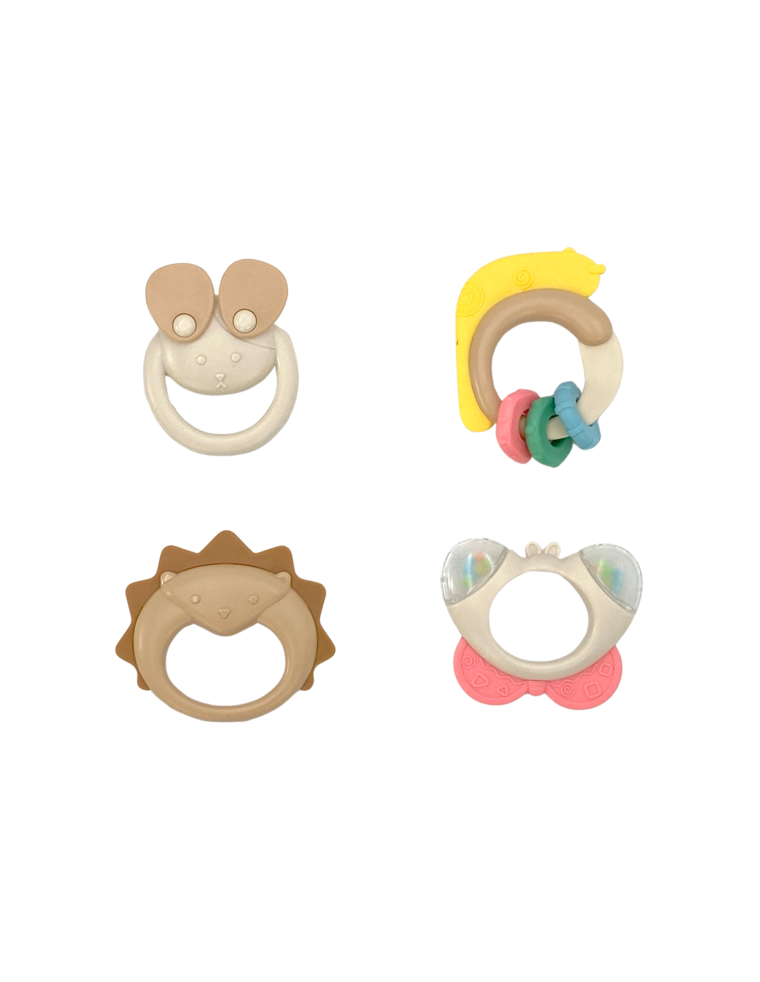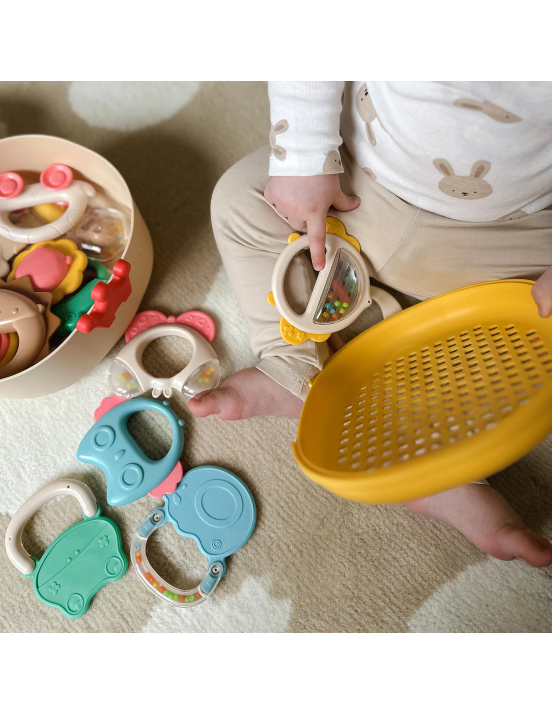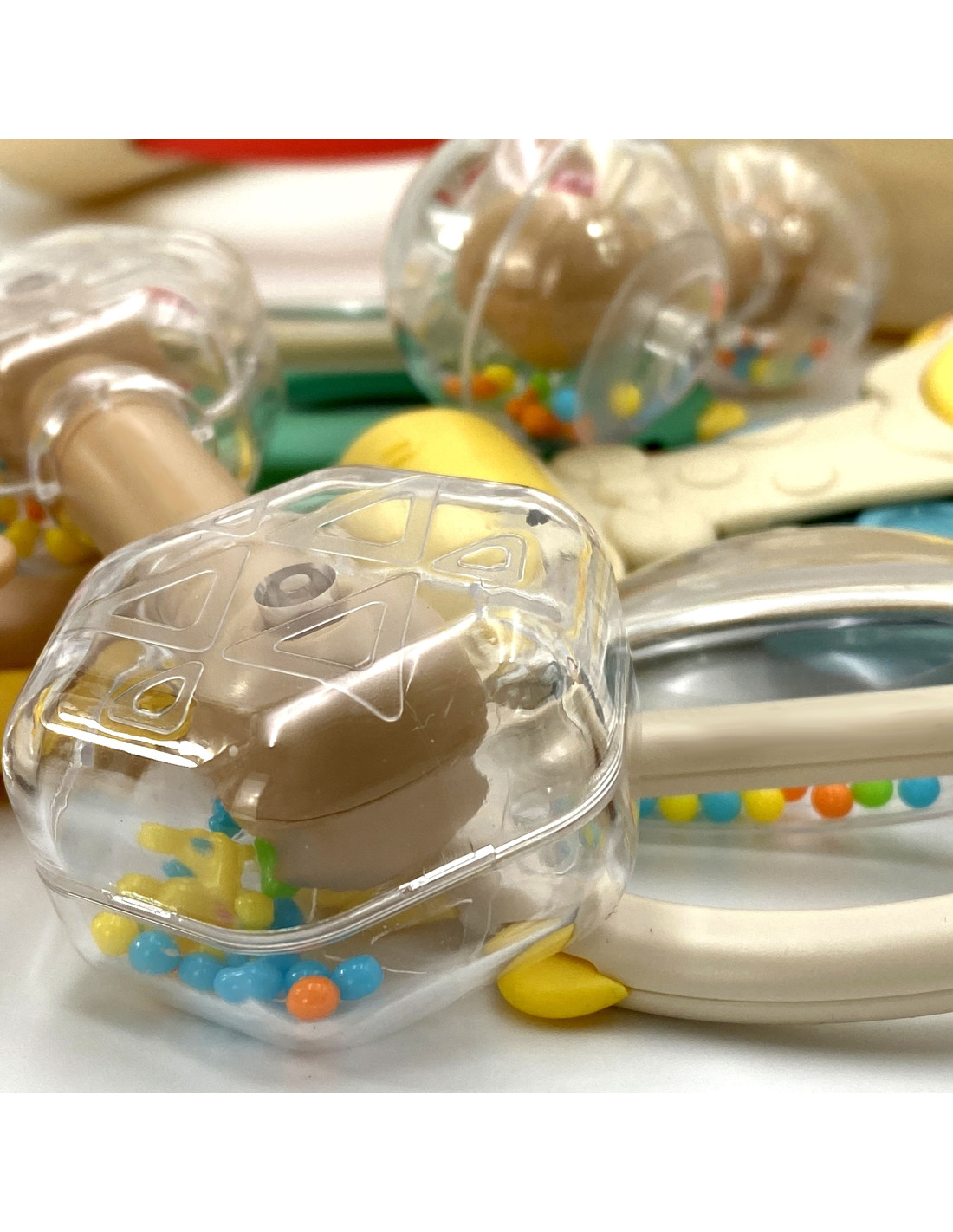 - - zestaw zawiera różnorodne grzechotki o różnych kształtach i fakturach,