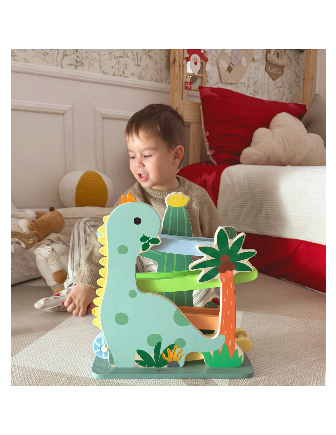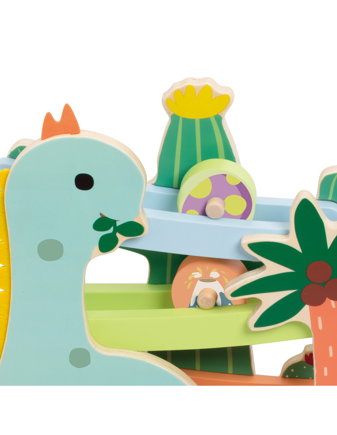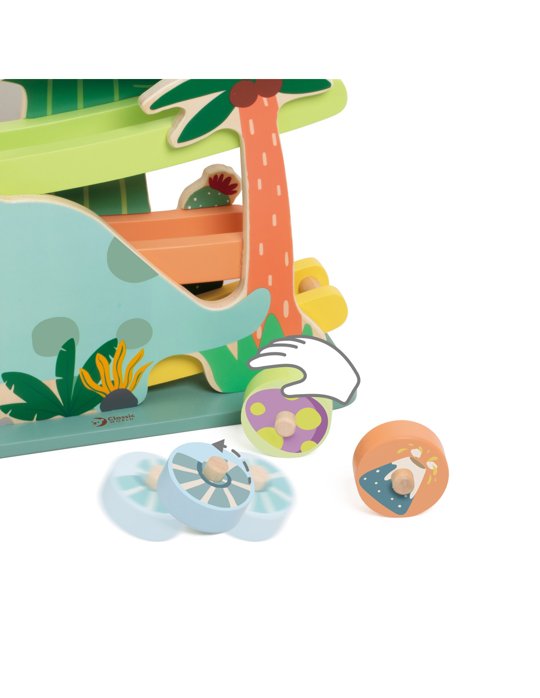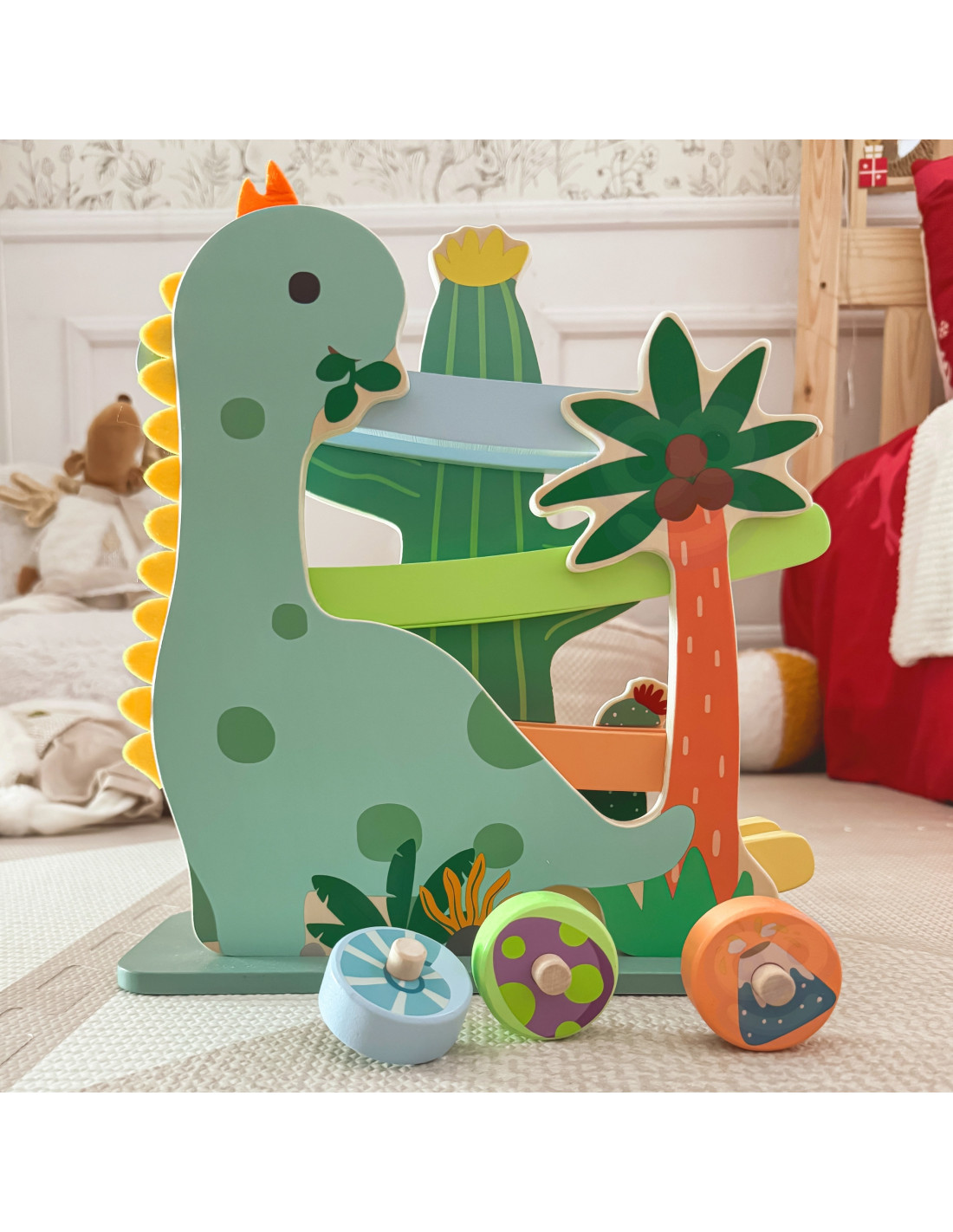 Ta kolorowa zjeżdżalnia dla dinozaurów od marki CLASSIC WORLD składa się z solidnej drewnianej zjeżdżalni i 4 uroczych okrągłych elementów ze środowiska dinozaurów, które inspirują wyobraźnię do przygód w ich świecie poprzez zabawę kinetyczną.