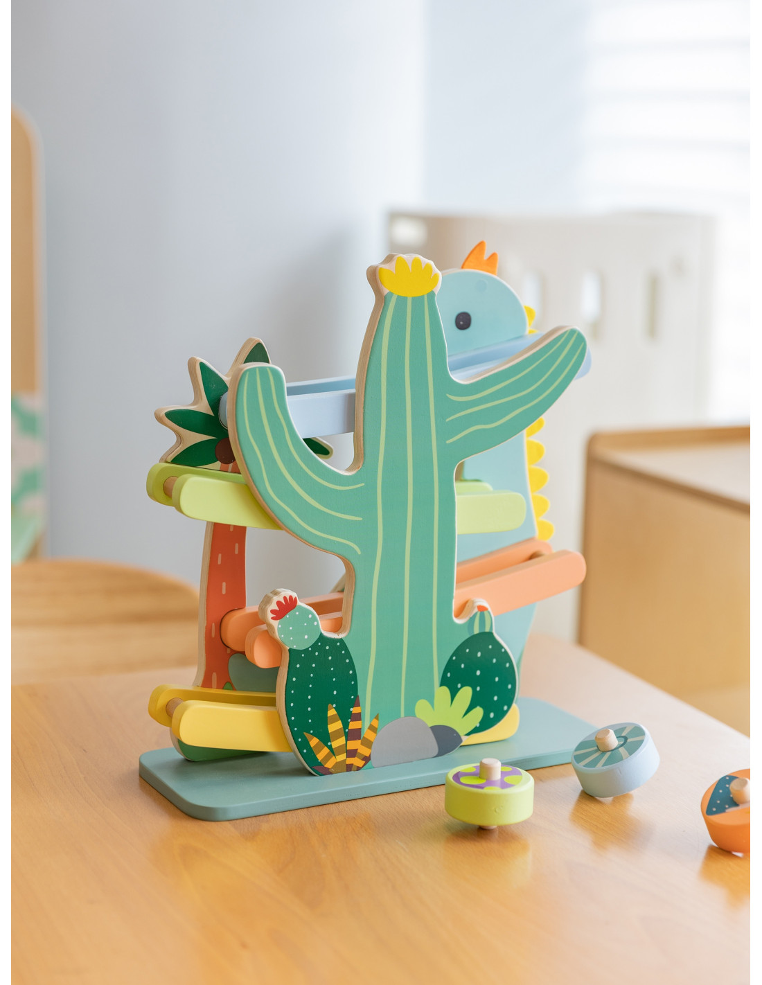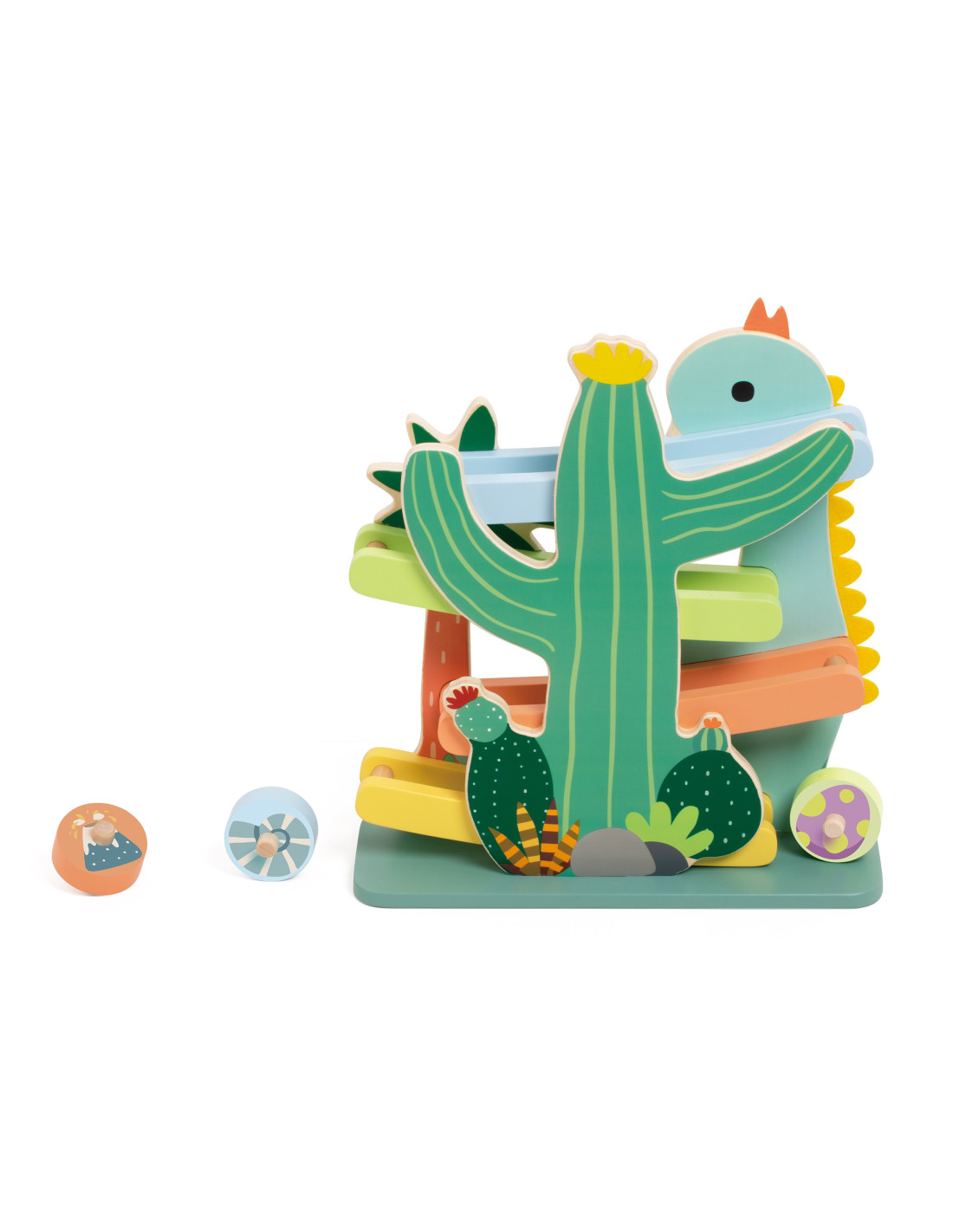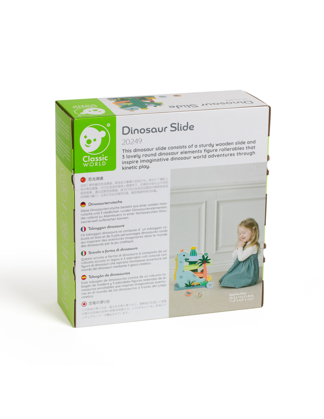 Ta kolorowa zjeżdżalnia dla dinozaurów od marki CLASSIC WORLD składa się z solidnej drewnianej zjeżdżalni i 4 uroczych okrągłych elementów ze środowiska dinozaurów, które inspirują wyobraźnię do przygód w ich świecie poprzez zabawę kinetyczną.
