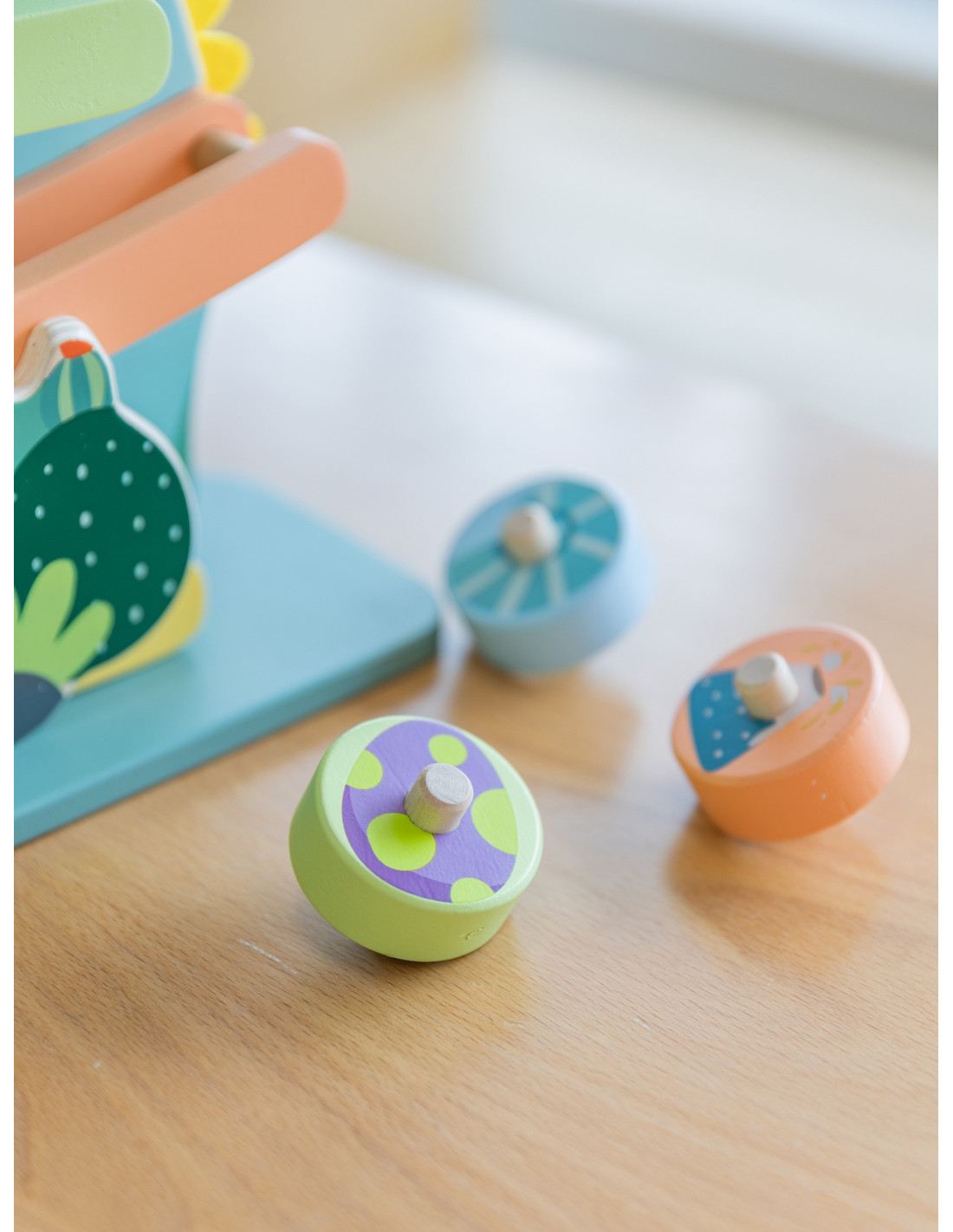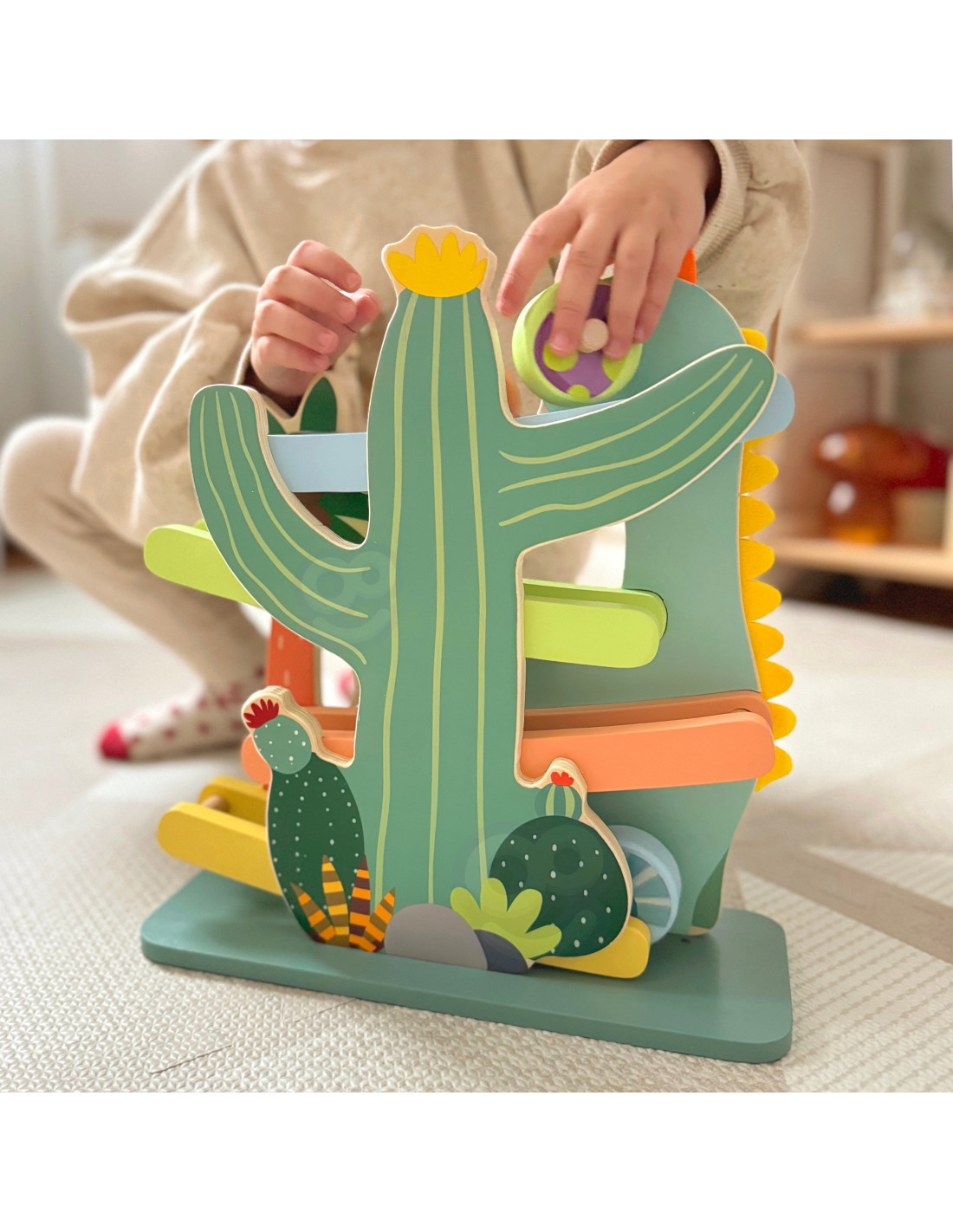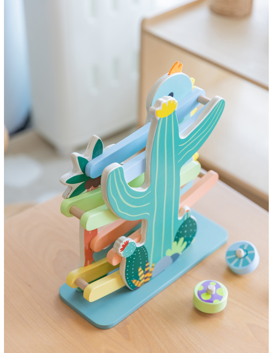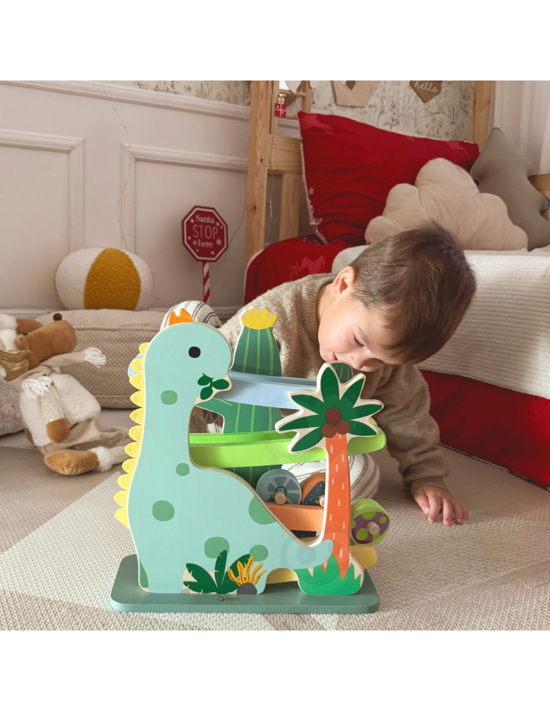 Ta kolorowa zjeżdżalnia dla dinozaurów od marki CLASSIC WORLD składa się z solidnej drewnianej zjeżdżalni i 4 uroczych okrągłych elementów ze środowiska dinozaurów, które inspirują wyobraźnię do przygód w ich świecie poprzez zabawę kinetyczną.