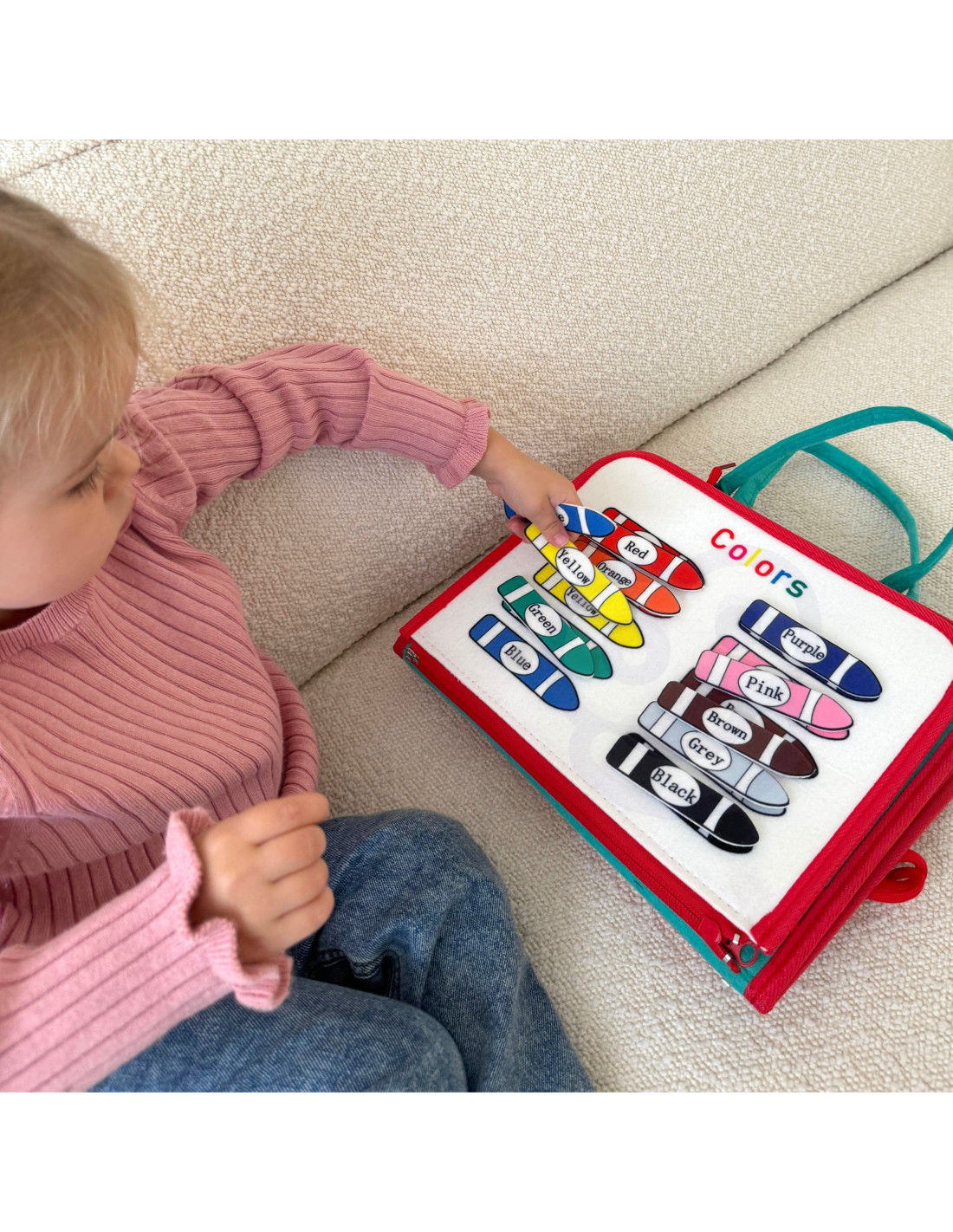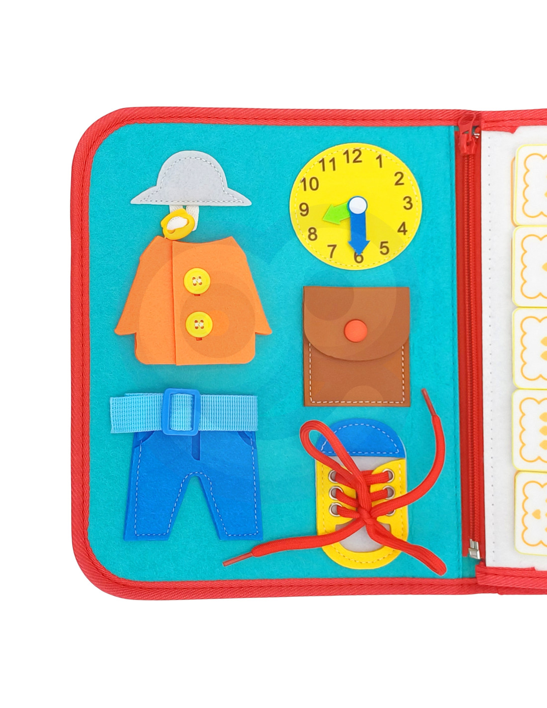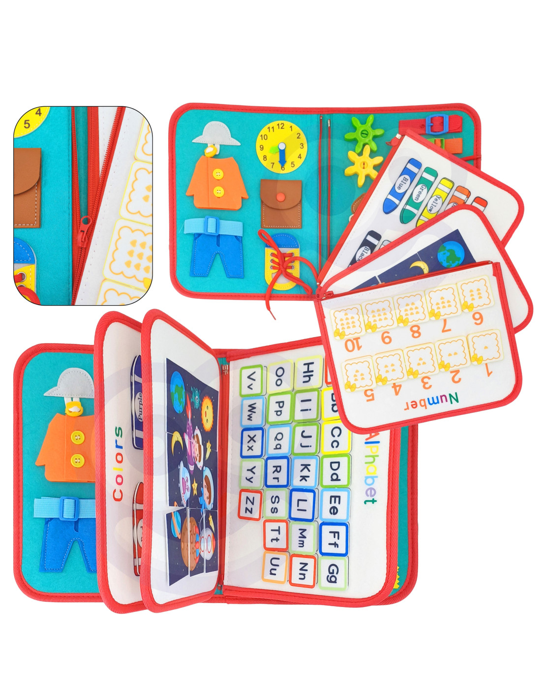 - - Zdejmowane warstwy Montessori. Warstwy tablicy można łatwo odpiąć dzięki zamkowi błyskawicznemu, co pozwala na indywidualną zabawę każdą z nich.