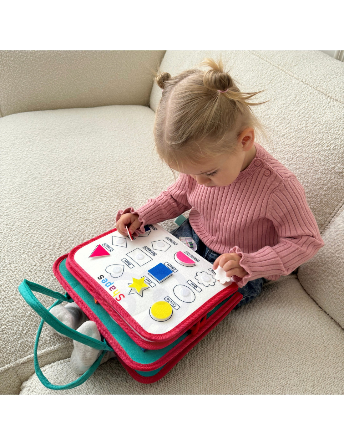 - - Zawiera 8 warstw pełnych różnorodnych aktywności, z których każda oferuje unikalne zadania edukacyjne, takie jak: nauka kolorów, liczb, alfabetu, kształtów geometrycznych, godzin, dni tygodnia oraz ćwiczenia manualne, jak wiązanie sznurówek czy zapięcia.