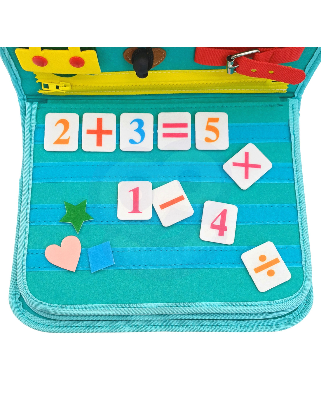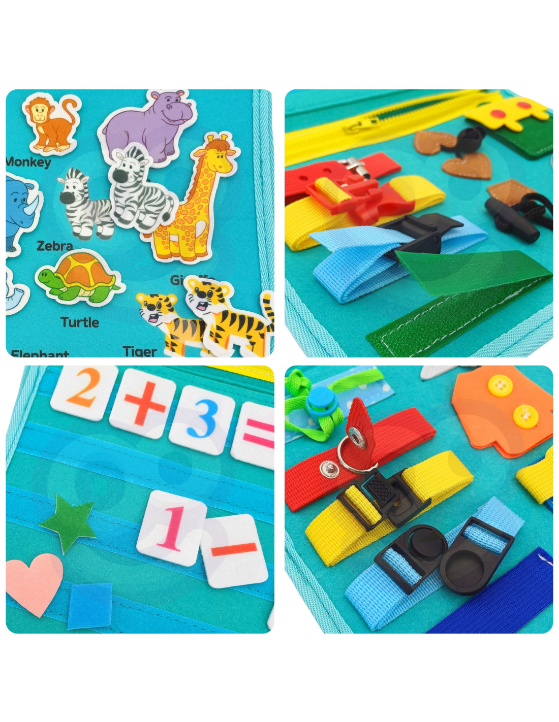 - - Zdejmowane warstwy Montessori. Centralne warstwy tablicy można łatwo odpiąć dzięki zamkowi błyskawicznemu, co pozwala na indywidualną zabawę każdą z nich.