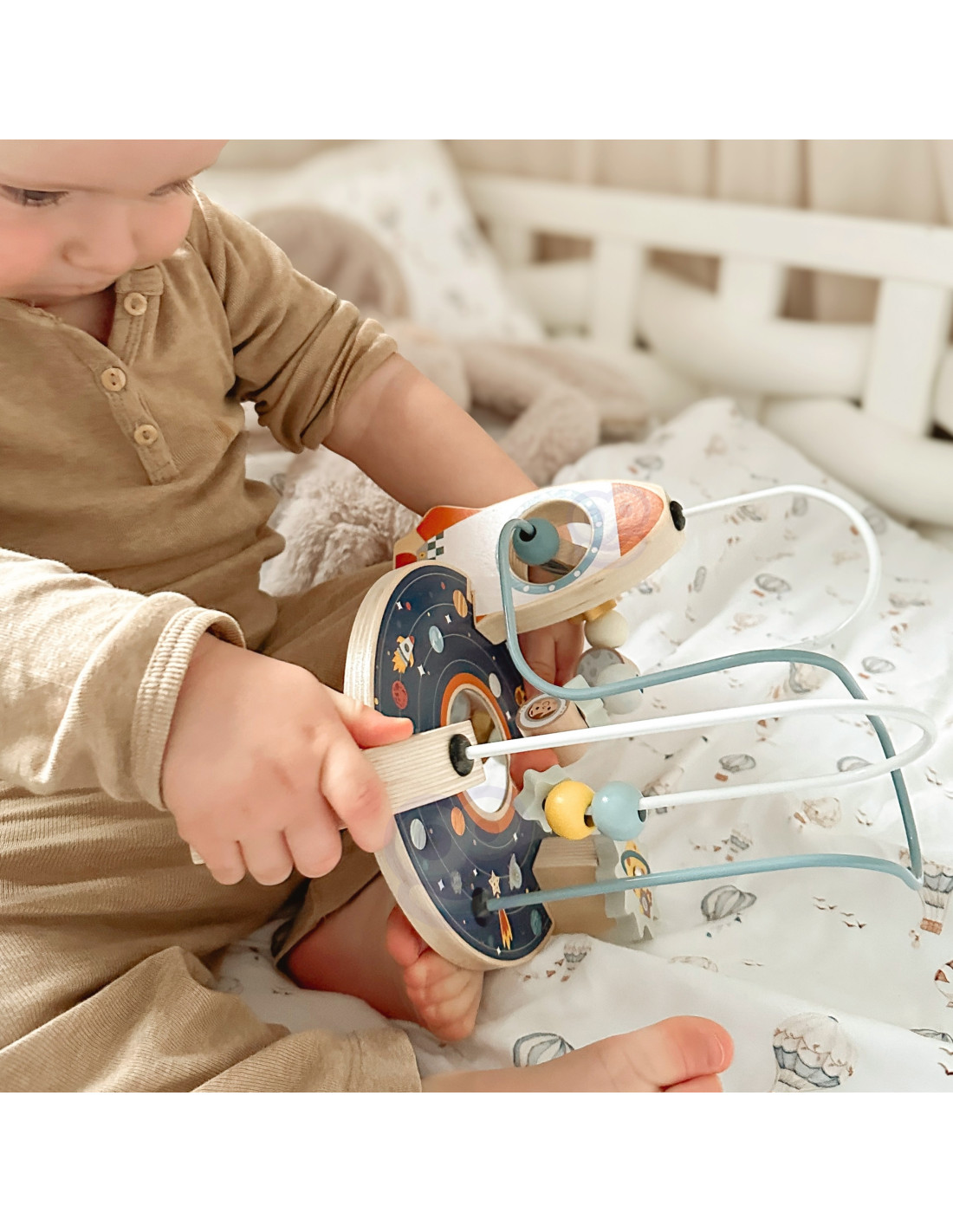 - - Ruchome elementy: Koraliki, gwiazdki i planety na pętlach, które dziecko może przesuwać